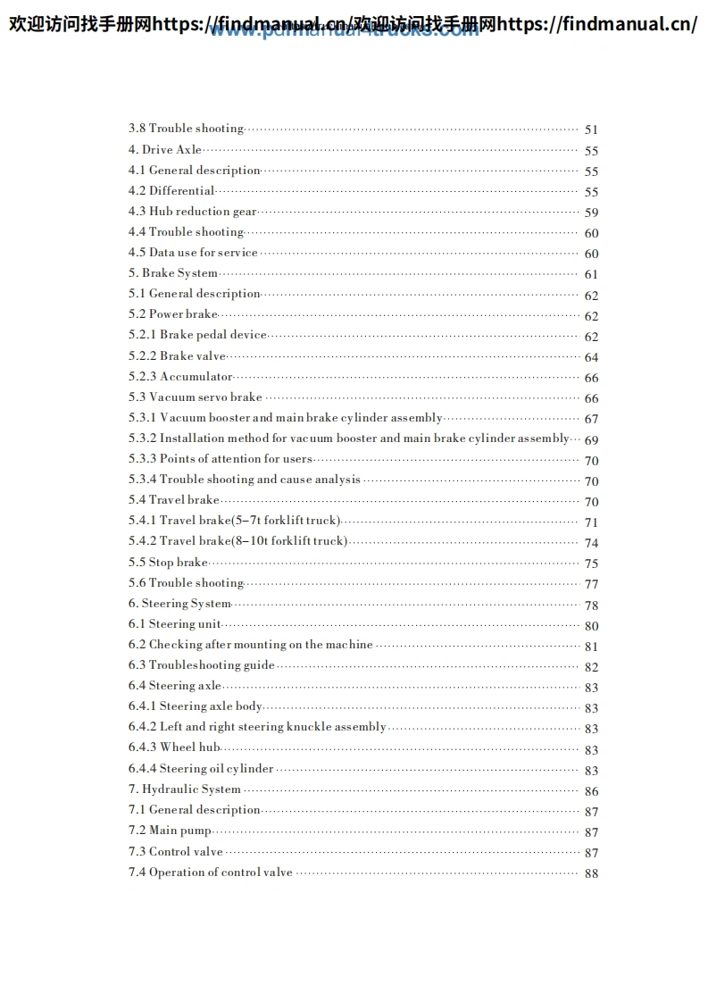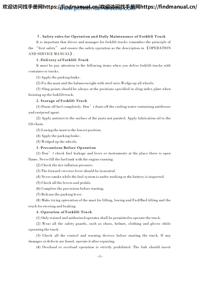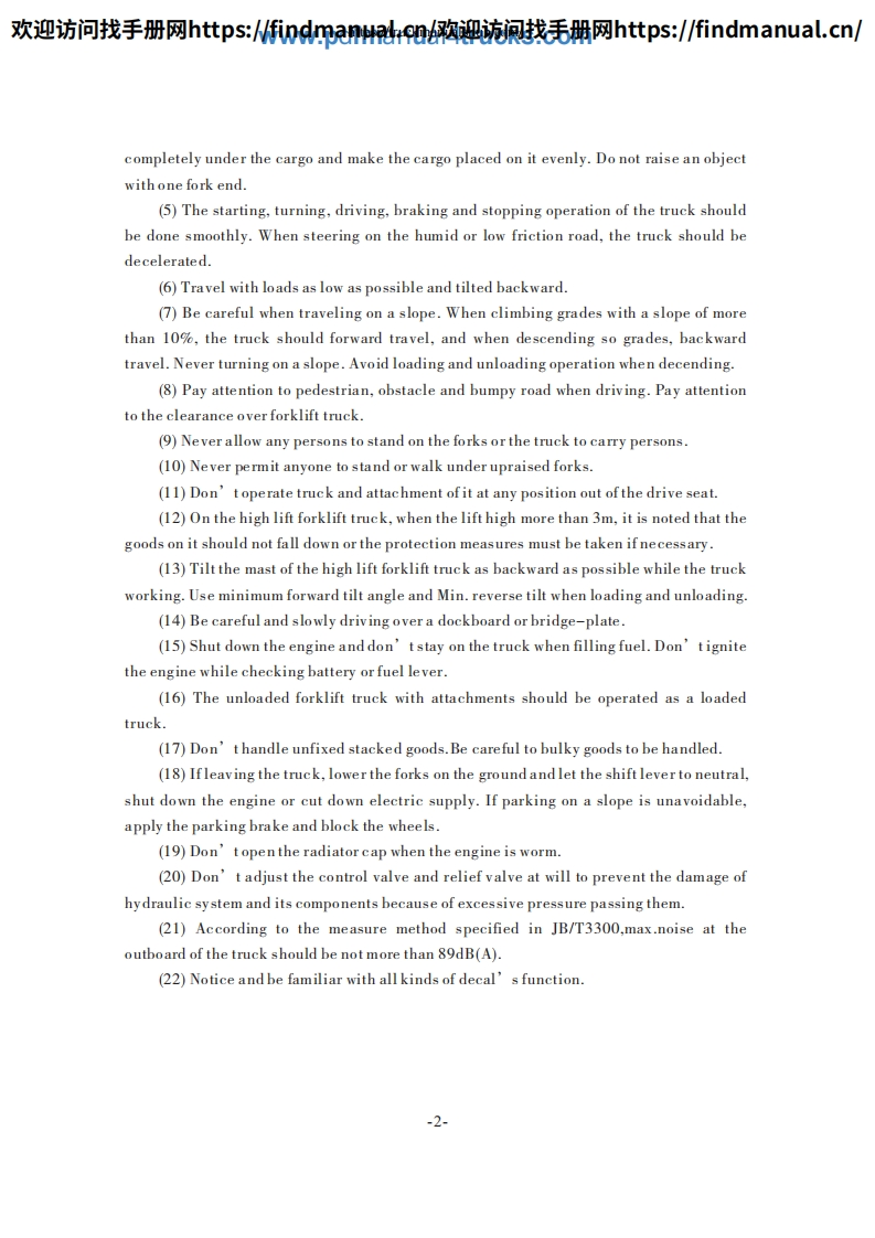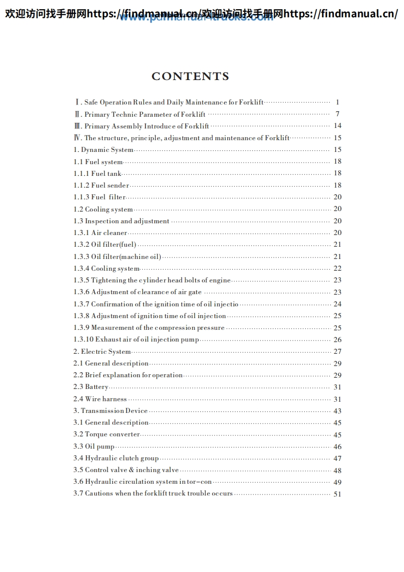 欢迎访问找手册网https::/findmanua购迎流讽找毛册网https::/findmanual.cn/FOREWORDThis manual accounts for "HELI"Forklift Truck in H2000 series from 5t to 10t,includes its performance,constructure,safe operation and regular preventivemaintenance,so that operators,mechanics and supervisors of Forklift Truck correctlyoperate and prevent maintenance.Read and understand this manual before operatingyour lift truck!This manual is your guide to safe operation and regular preventivemaintenance.So as to let the Forklift Truck keep good working conditions.If any operation or maintenance does't accord with requires in this manual,ourrelated promises is inefficacy.Due to continuous improvements in design,it is possible that the latest descriptioncontained herein may differ slightly from the truck delivered to you.Moreover,thespecification of the forklift truck may be changed insignificantly depending on itsdestination.Notice:Designations in the CATALOGUE are difference from those in productnameplates and quaulifying licenses.Designations in the CATALOGUE include enginecode and number of remodification.CPCD50 -W2Engine code and number of remodification.Type.