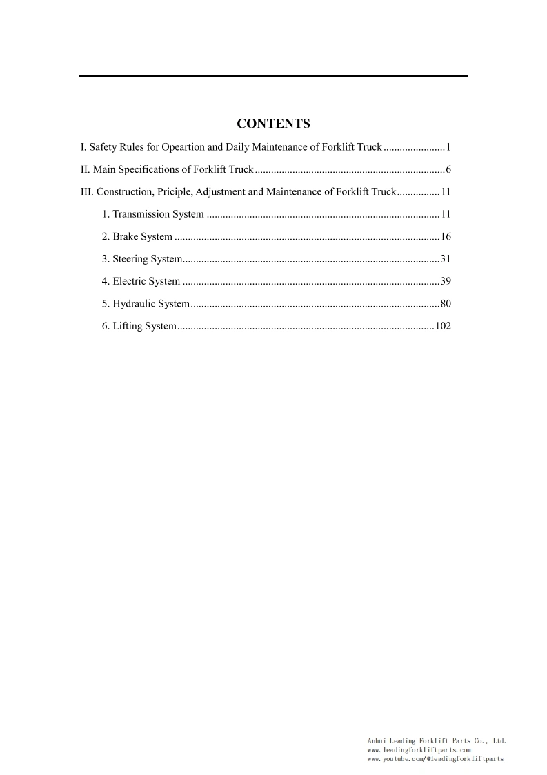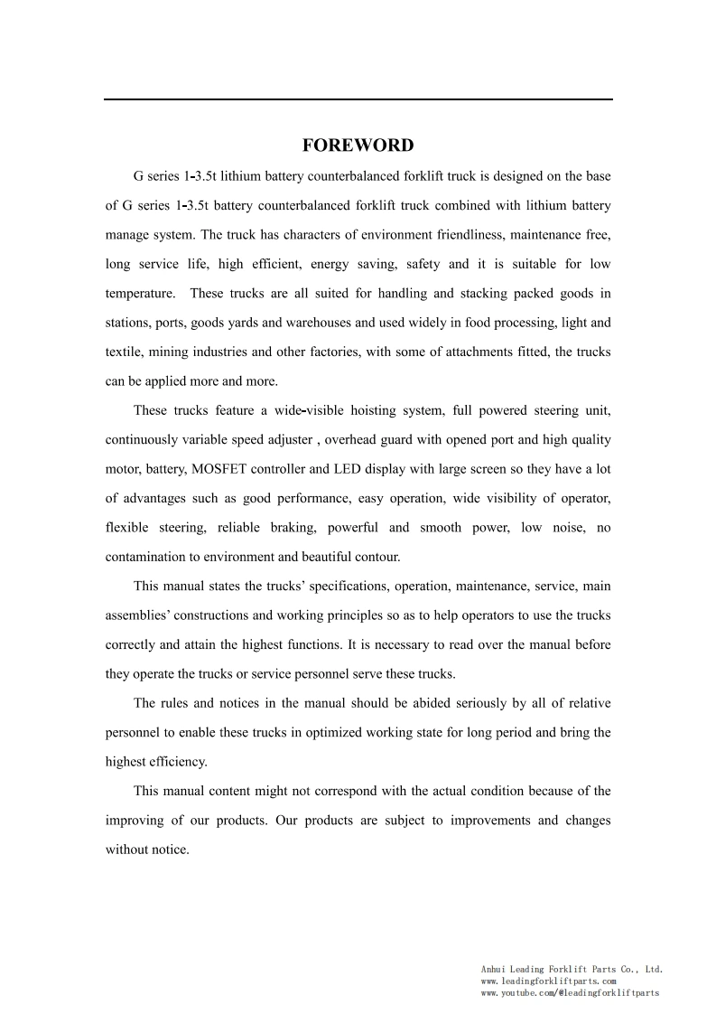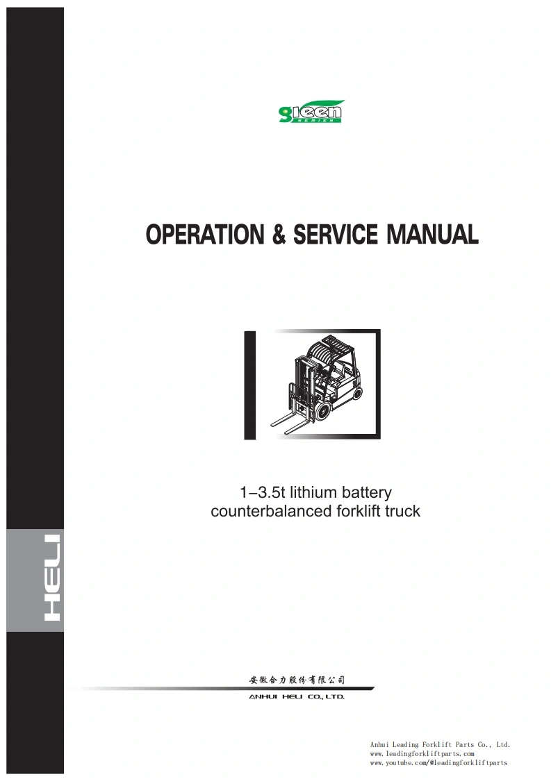 9OPERATION SERVICE MANUAL1-3.5t lithium batterycounterbalanced forklift truckHELI Forklift Operation ManualCPCD35 HELI Lithium Forklift TruckFor HELI G Series 1-3.5T Lithium BatteryCounterbalanced Forklift TruckThis HELI forklift operation and service manual is for a G series 1-3.5T lithium batterycounterbalanced forklift truck.It should be abided seriously by all of the relative personnelto enable these forklift trucks in an optimized working state for a long period and bring thehighest efficiency.This manual states the HELI forklift truck's specifications,operation,maintenance,service,construction,and working principles to help operators use the forklift trucks correctly andattain the highest functions.Anhui Leading Forklift Parts Co.,Ltd.www.leadingforkliftparts.comwww.youtube.com/@leadingforkliftparts
