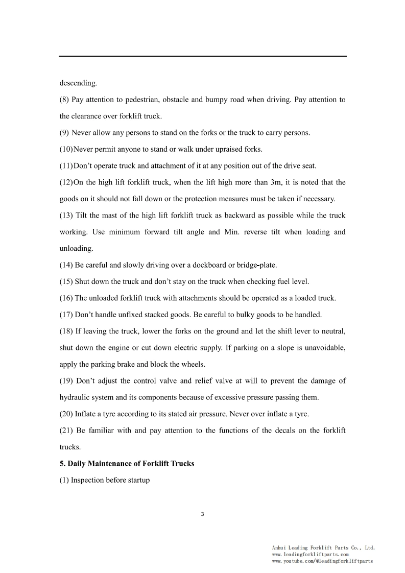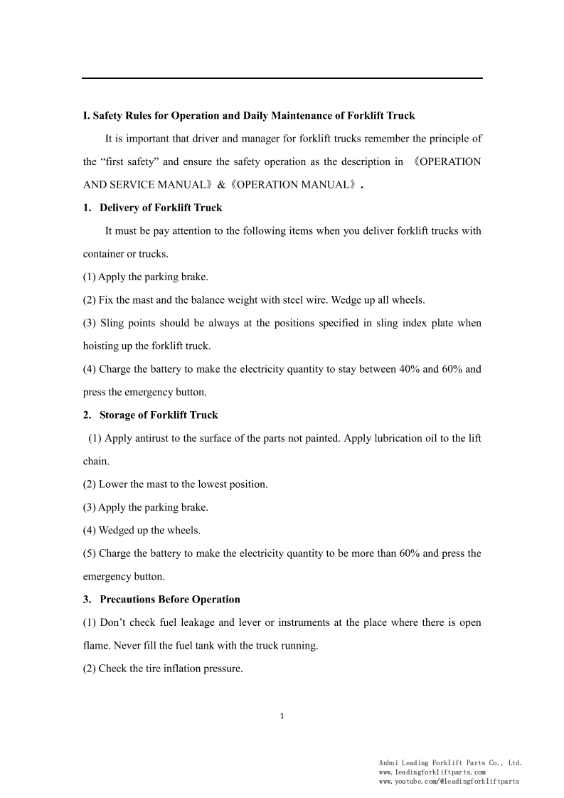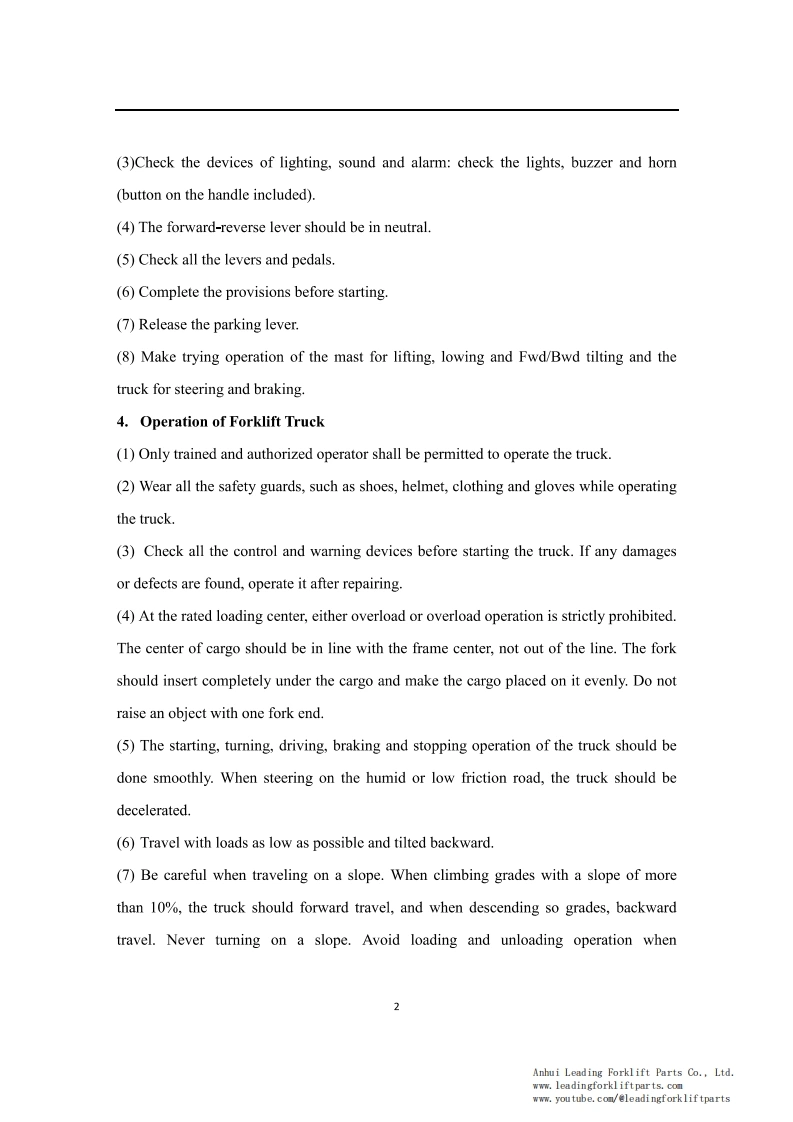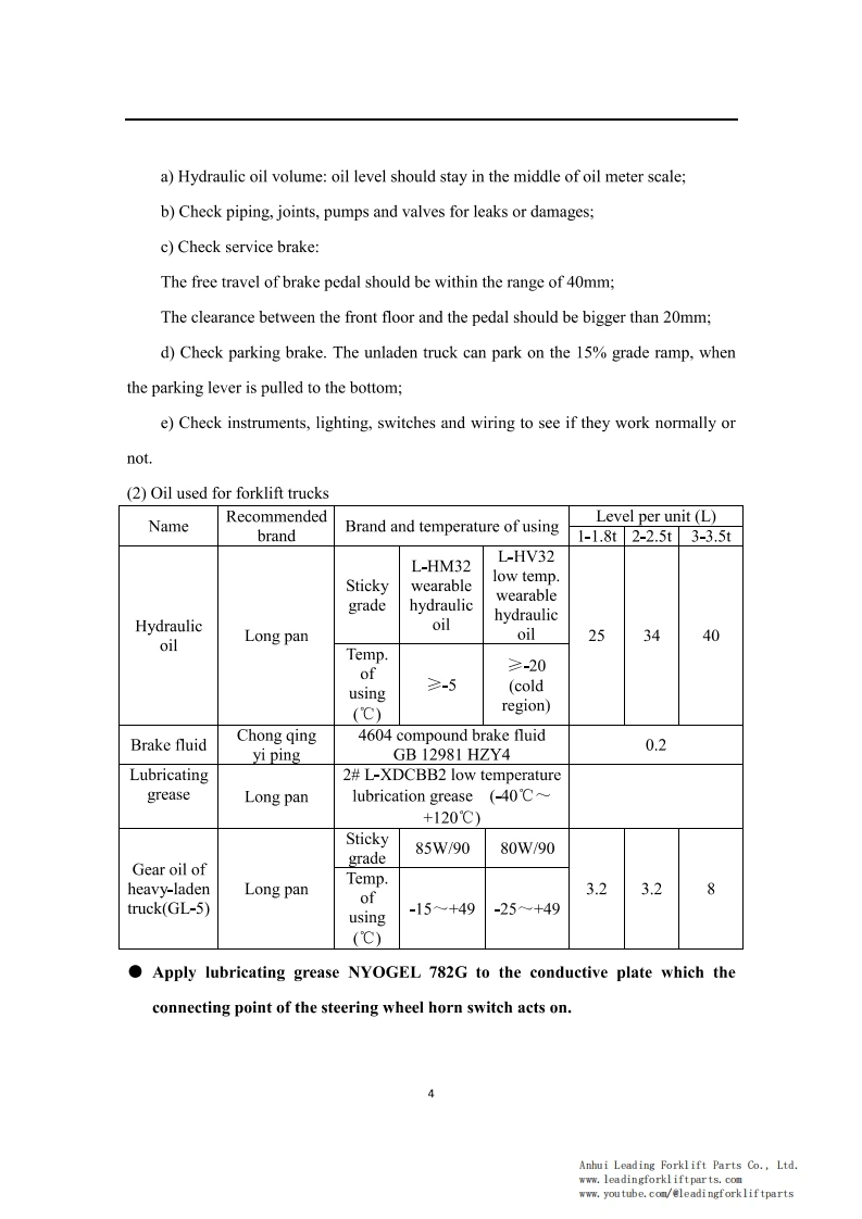 9OPERATION SERVICE MANUAL1-3.5t lithium batterycounterbalanced forklift truckHELI Forklift Operation ManualCPCD35 HELI Lithium Forklift TruckFor HELI G Series 1-3.5T Lithium BatteryCounterbalanced Forklift TruckThis HELI forklift operation and service manual is for a G series 1-3.5T lithium batterycounterbalanced forklift truck.It should be abided seriously by all of the relative personnelto enable these forklift trucks in an optimized working state for a long period and bring thehighest efficiency.This manual states the HELI forklift truck's specifications,operation,maintenance,service,construction,and working principles to help operators use the forklift trucks correctly andattain the highest functions.Anhui Leading Forklift Parts Co.,Ltd.www.leadingforkliftparts.comwww.youtube.com/@leadingforkliftparts