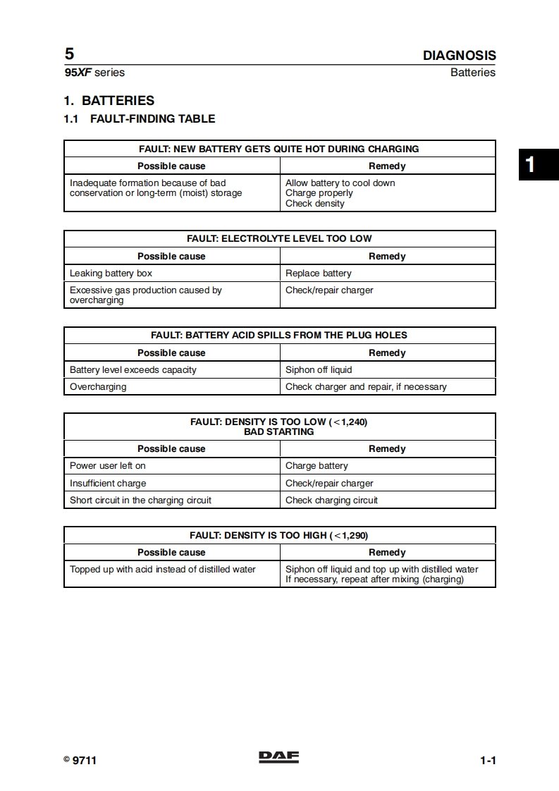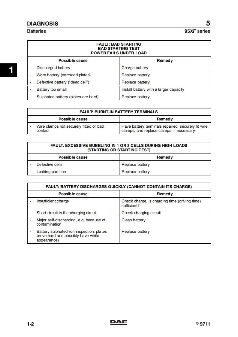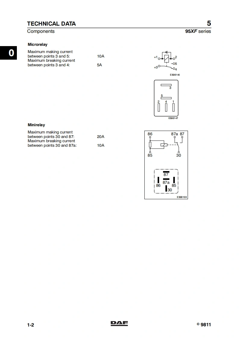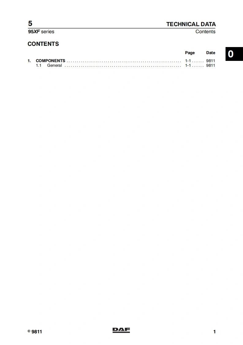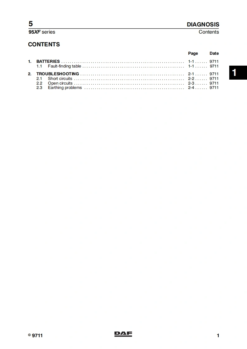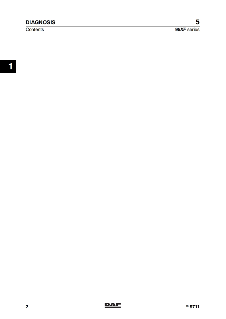 5CONTENTS95XF seriesTECHNICAL DATADIAGNOSISCOMPONENTSBATTERIESMASTER SWITCHESCONNECTING ACCESSORIESREADING DIAGRAMSLOCATION OF COMPONENTSLOCATION OF CONNECTORS9ELECTRICAL INSTALLATION10MODIFICATIONS TO THE ELECTRICAL INSTALLATION11ELECTRICAL SYSTEM:OPTIONS AND SPECIAL APPLICATIONS12©0209DAF