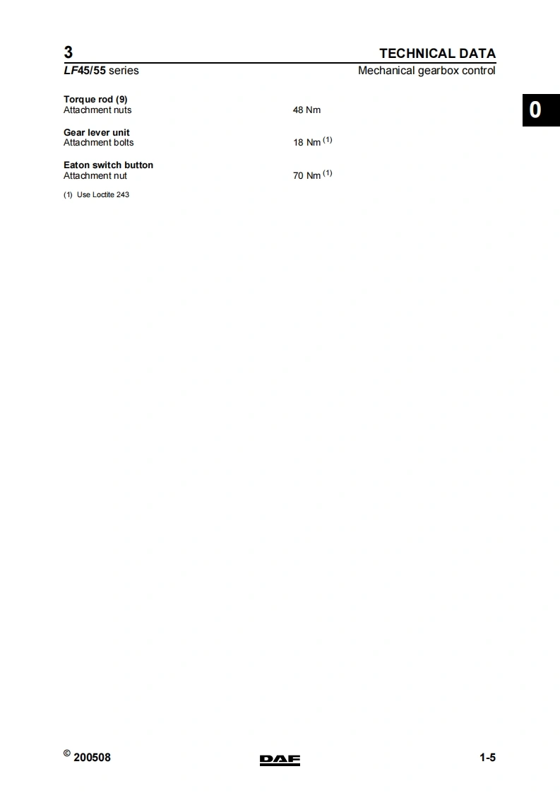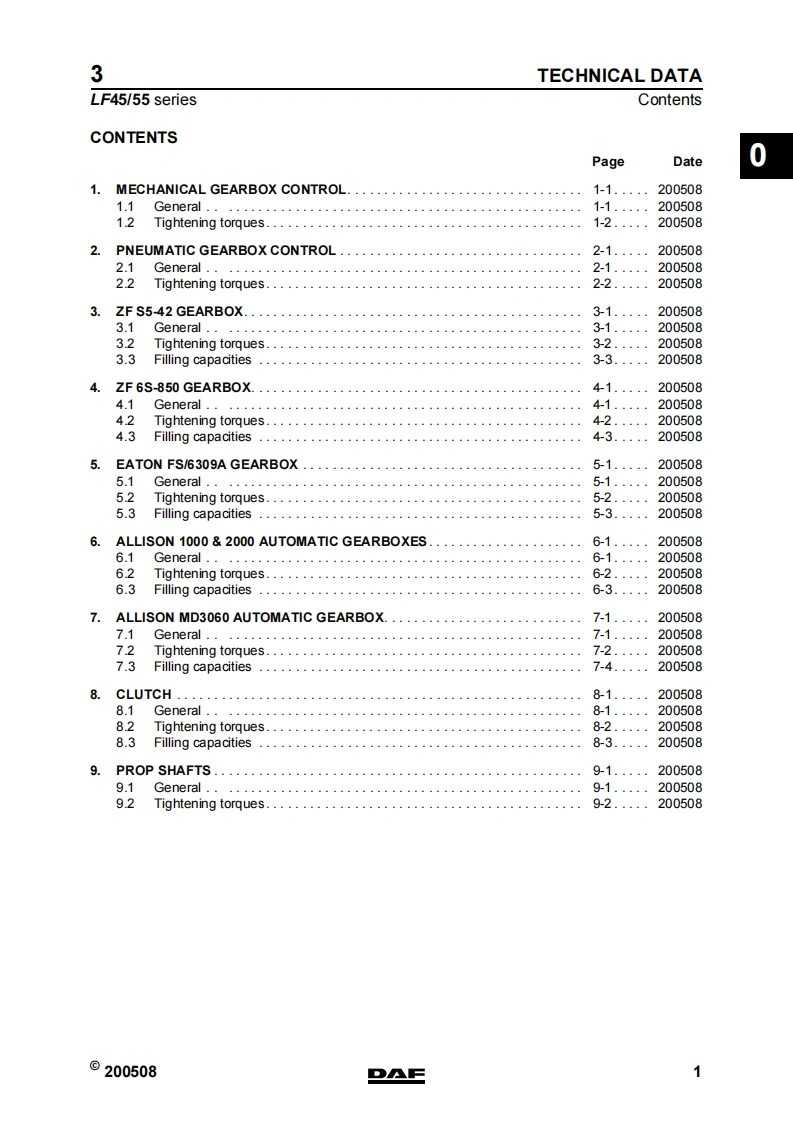 3STRUCTURELF45/55 seriesTECHNICAL DATADIAGNOSTICSMECHANICAL GEARBOX CONTROLPNEUMATIC GEARBOX CONTROL3ZF S5-42 GEARBOXZF 6S-850 GEARBOXEATON FS/6309A GEARBOX6ALLISON 1000&2000 AUTOMATIC GEARBOXESALLISON MD 3060 AUTOMATIC GEARBOX8CLUTCH9PROP SHAFTS10©200508DAFDW23259302