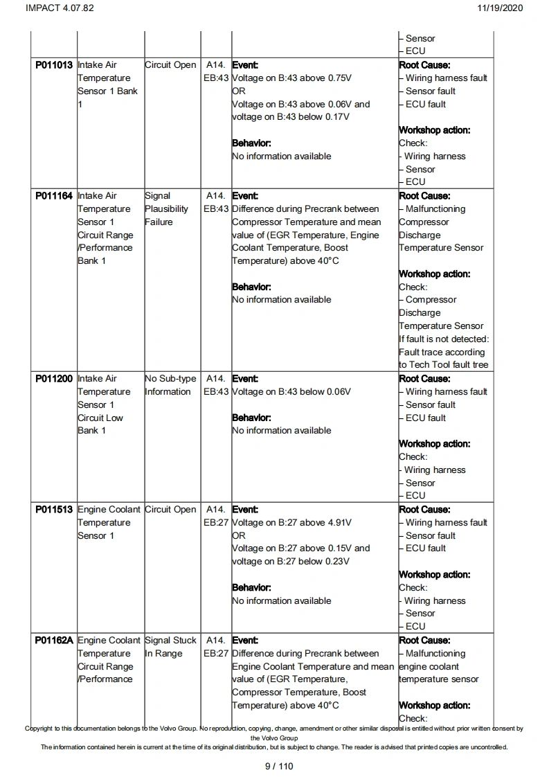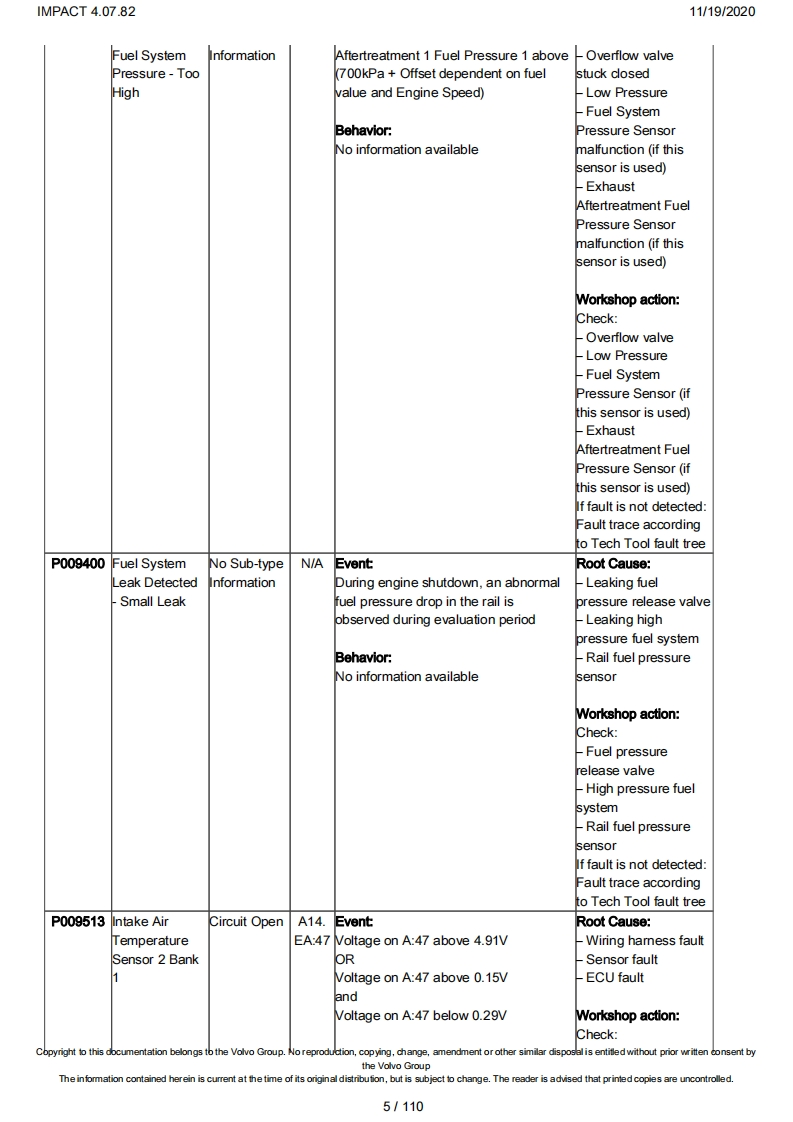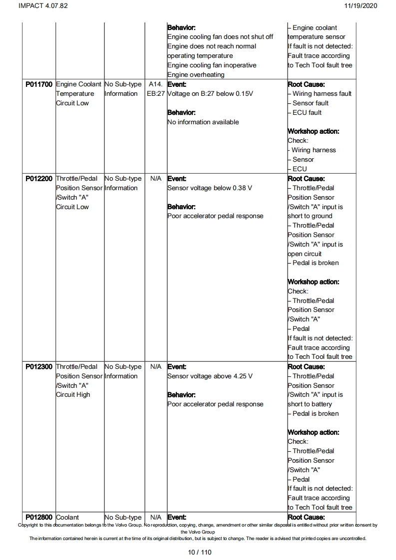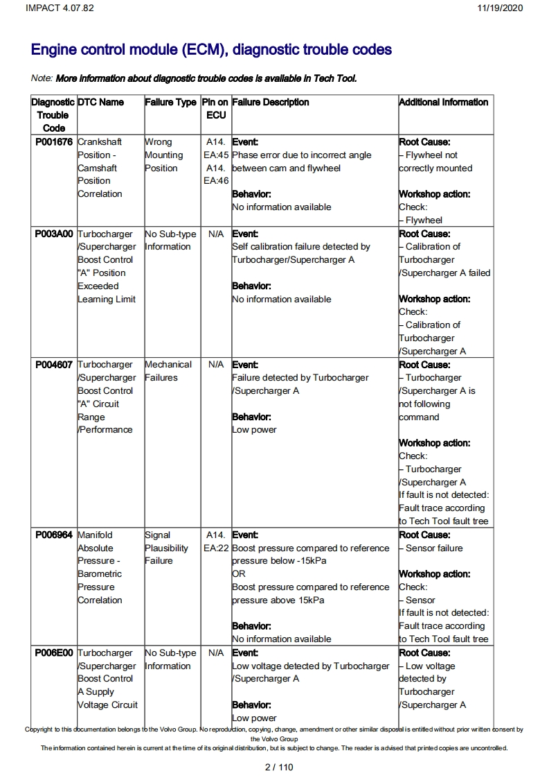 IMPACT 4.07.82ServiceChassis IDPath284/Diagnostics//Engine control module (ECM),diagnostic trouble codesModelIdentity140225418Publish dateID/Operation12/12/2017Copyright to this documentation belongs to the Volvo Group.No reproduction,copying,change,amendment or other similar disposal is entitled without prior written consent bythe Volvo GroupThe information contained herein is current at the time of its original distribufion,but is subject to change.The reader is advised that printed copies are uncontrolled.1/110