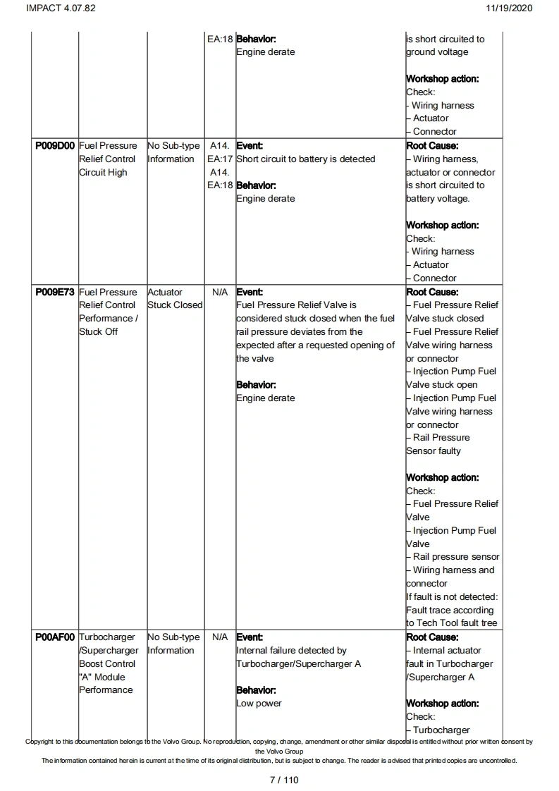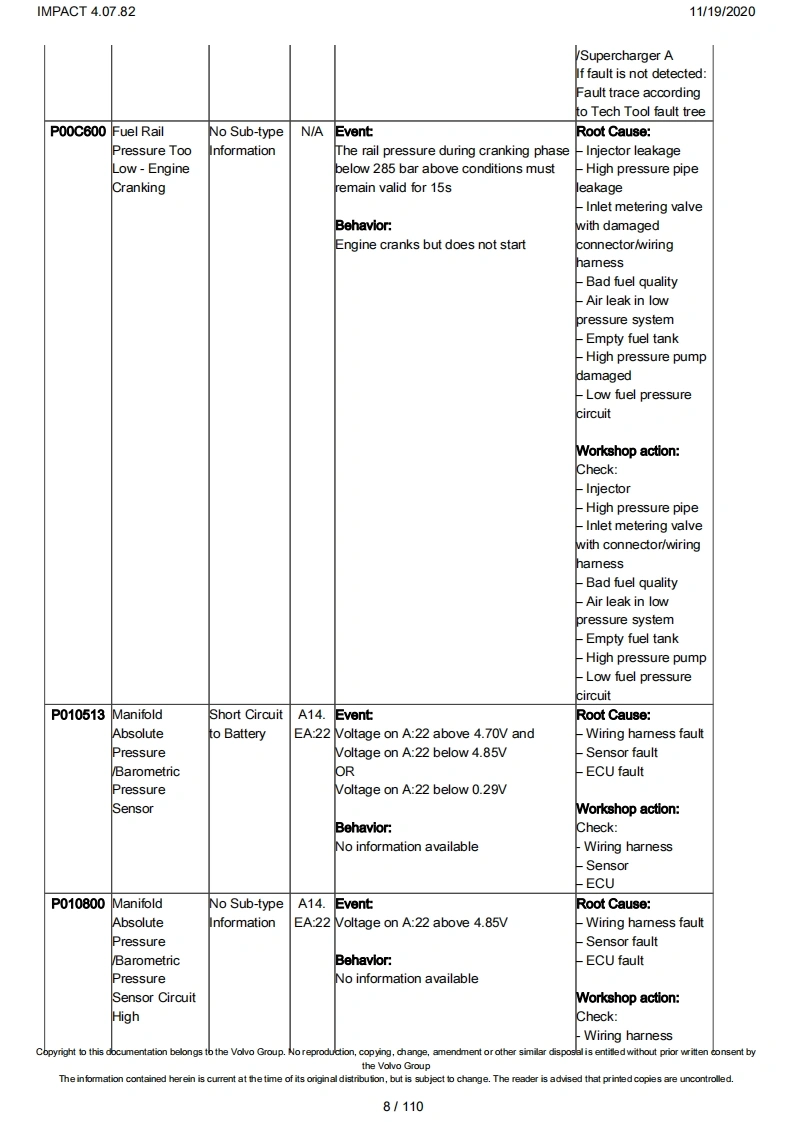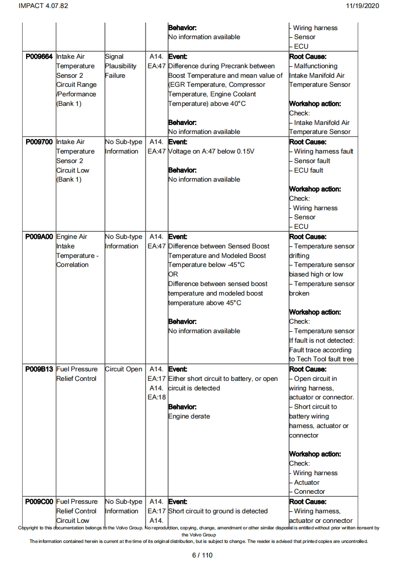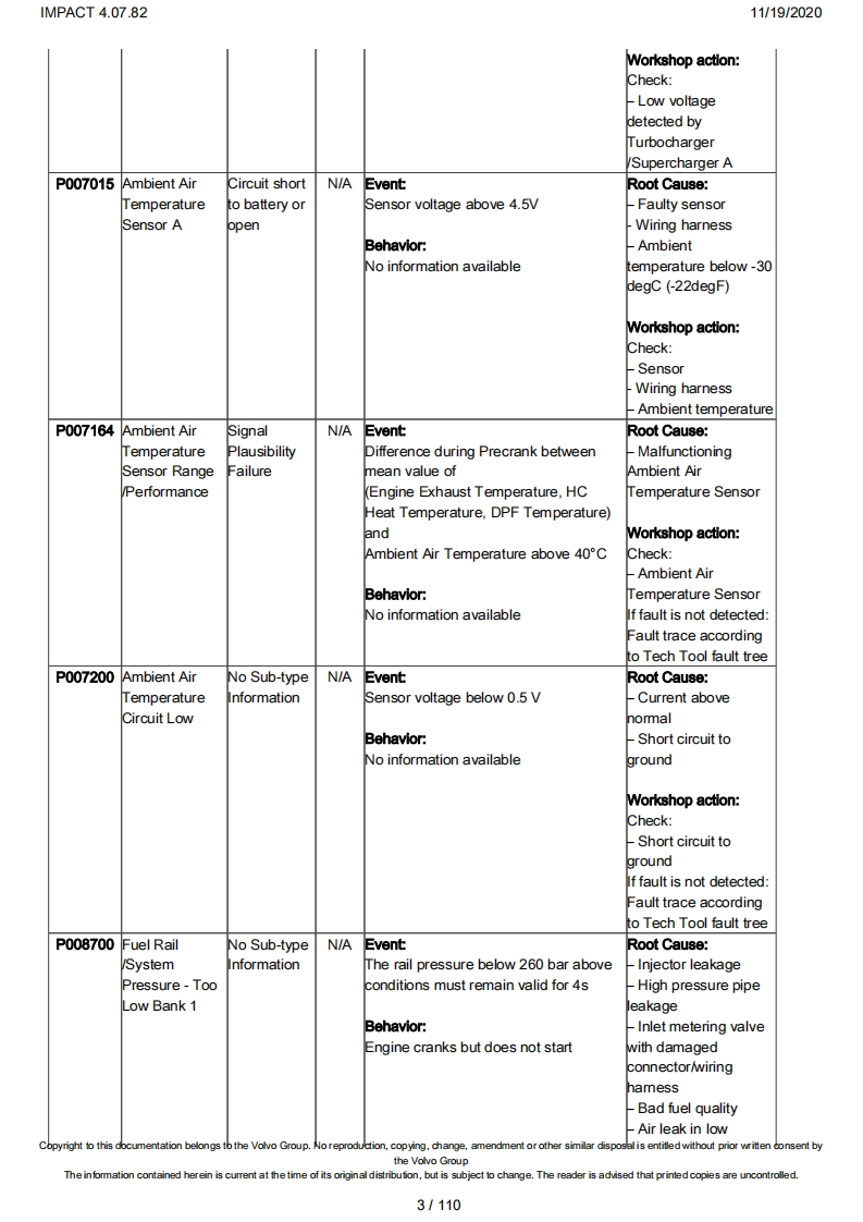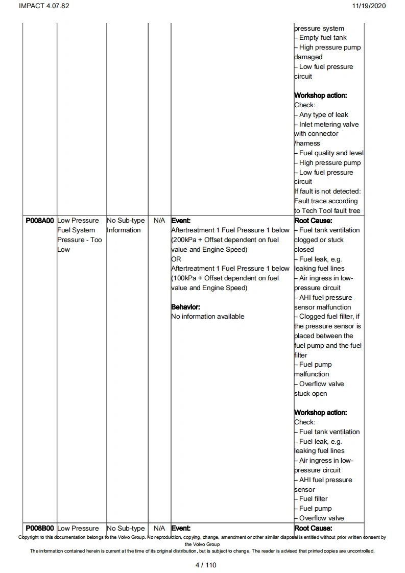 IMPACT 4.07.82ServiceChassis IDPath284/Diagnostics//Engine control module (ECM),diagnostic trouble codesModelIdentity140225418Publish dateID/Operation12/12/2017Copyright to this documentation belongs to the Volvo Group.No reproduction,copying,change,amendment or other similar disposal is entitled without prior written consent bythe Volvo GroupThe information contained herein is current at the time of its original distribufion,but is subject to change.The reader is advised that printed copies are uncontrolled.1/110