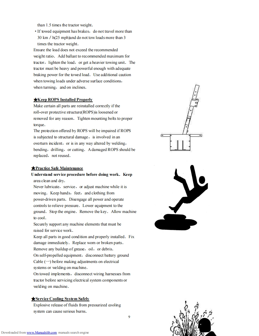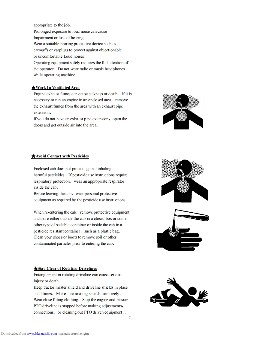 CONTENTS Service Manual 304G2SafetyPrecautionsAEMEENANNENNENAE NNNNEE N NNNANNE M EE N AN MChapter IWork safely Always and safety Rules .........................14Chapter IlTechnical Specifications of the Tractor..........................18Chapter IllRunning-in of the Tractor....23Chapter IVOperating the Tractor..25Chapter VAdjustments of the Tractor...................31Chapter VILubrication and Maintenance of the Tractor......................43Chapter VIlTroubles and Trouble-shooting......................47Appendix 1Moving Locus Diagram of Lifting Linkages.................................57Appendix 2Moving Locus Diagram of Lifting Linkages..................58Appendix 3Diagram of Electrical System Principle59Appendix 4ListofRubberOil-sealandO-ring60Seal.........................Appendix 5List of Bearings.………62Appendix 6Tightening Torque Table of Main Bolts and Nuts........................63Appendix 7Optional Accessories.63Appendix 8List of Attached Tools......……64Appendix 9Packing65List.”8a日8aPRE-DELIVERY SERVICE.66Downloaded from www.Manualslib.com manuals search engine