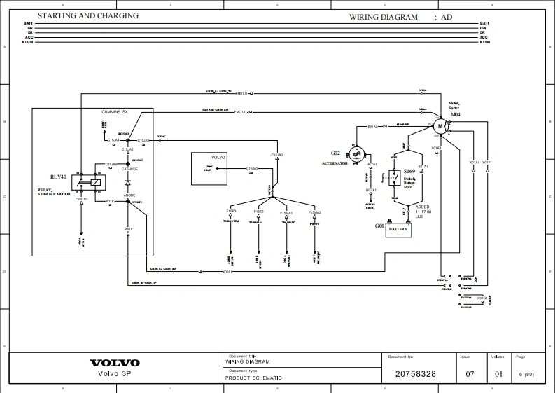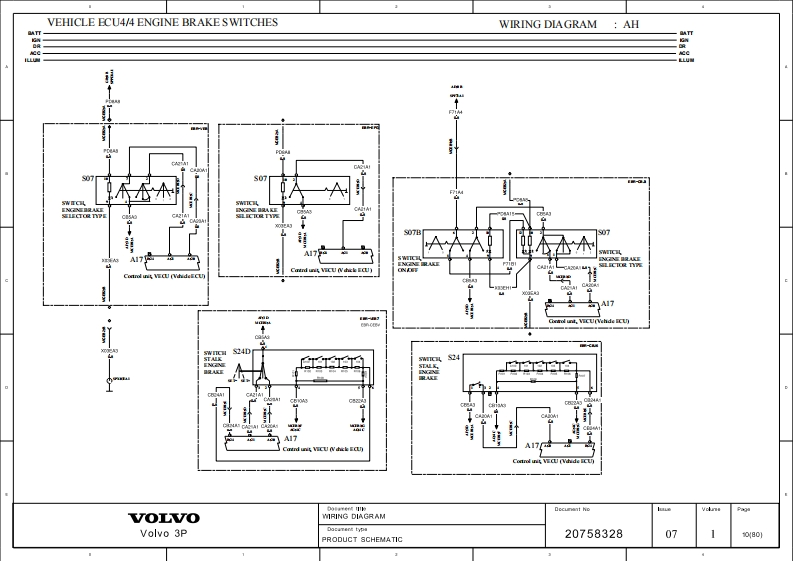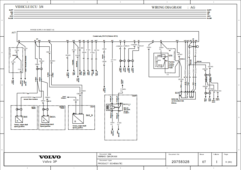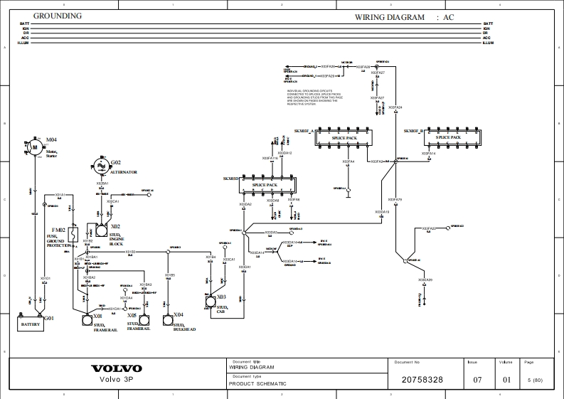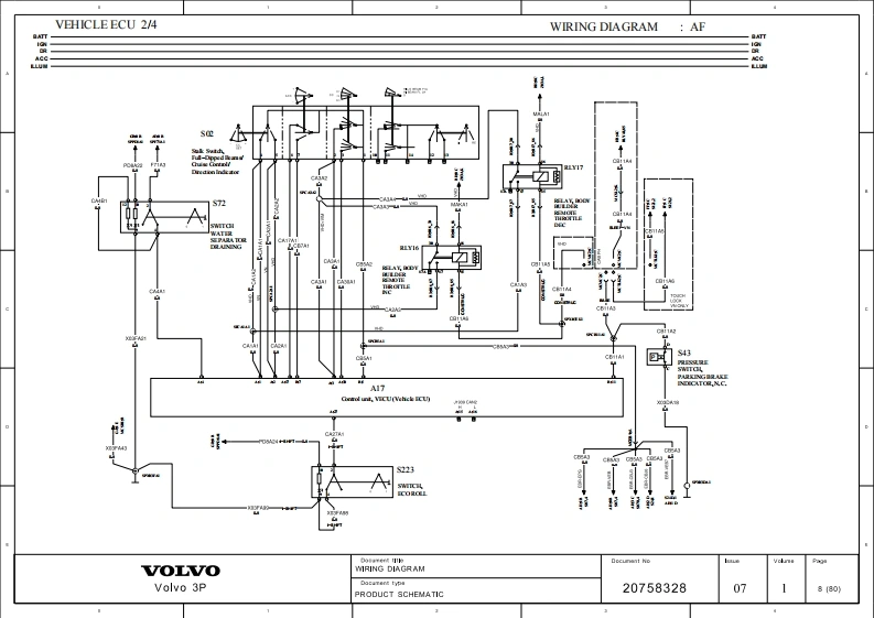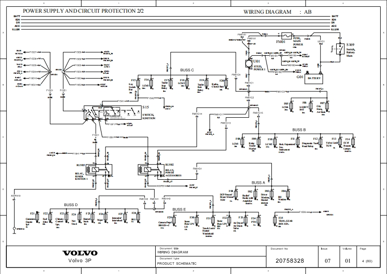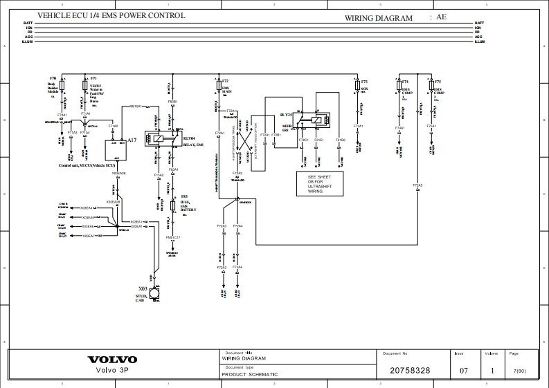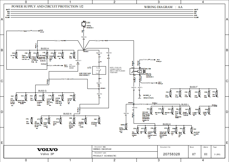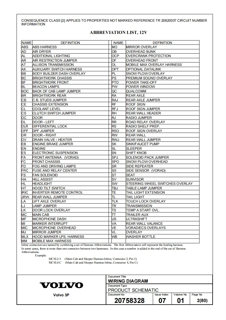 Engineering ReleaseLocationChange DescriptionA=AddedW=WasDocument Release StatusNotice (ERN)D=DeletedRELEASEDDateModifica fion CountSEE DCNWIRING DIAGRAM INDEX,12VNAmeDESCRIPTIONPAGE NAMEDESCRIPTIONPAGEAAPOWER SUPPLY,CIRCUIT PROTECTION 1/23GB_IGHTING CONTROL 2/243ABPOWER SUPPLY,CIRCUIT PROTECTION 2/2GCMARKER LAMPS44ACGROUNDINGGDDRIVING/SIGNAL LIGHTS45ADSTARTING AND CHARGING6GEDRIVING/FOG LIGHTS46AEVEHICLE ECU 1/4 EMS POWER CONTROLGFTAIL LAMPS W/ALARM47AFVEHICLE ECU 2/4GGBACK OF CAB LAMPS L148AGVEHICLE ECU 3/49GHBACK OF CAB LAMPS L3-L549AH VEHICLE ECU 4/4 ENGINE BRAKE SWITCHES10GSNOW PLOW BEACON LAMPS50BAINSTRUMENTATION CLUSTERA/B11GJBEACON LAMPS51BB INSTRUMENTATION CLUSTERC12GKBACKUP LAMPS WITH ALARM52BCINSTRUMENTATION ROAD RELAY13GPWIPER WASHER53BDINSTRUMENTATION OPTIONAL GAUGES14GOHORN54BECOMMUNICATIONS QUALCOMM/OMNIVISION15HACLIMATE CONTROL55BFCOMMUNICATIONS VOLVO ACTION LINK (VAL)16HBSLEEPER CLIMATE CONTROL W.LECM56BGCOMMUNICATIONS MOBILE MAX II17HCSHORE POWER INVERTER57BHBODY BULDER18HDL3-L4 SLEEPER FUNCTIONS58B卧BODY BUILDER MODULE19HEL5 SLEEPER FUNCTIONS59BJTELEMATICS GATEWAY(TGW)20HHL5H2 SLEEPER FUNCTIONS60CA ETHER START/ENGINE HEATER21IAINTERIOR COURTESY LIGHTS61CBENGINE CONTROL VOLVO ENGINES22IBHEATED SEATS/SEATBELT/HEATED W.S62CC ENGINE CONTROL ISX US0723ICPOWER WINDOWS/MIRRORS W.DCP63CEFUEL FILTER HEATER24IDPOWER WINDOWS/MIRRORS W/O DCP64CHINSIDE/OUTSIDE AIR CLEANER25PWR WINDOWS/MIRRORS W/TURN SIGNALS65DATRANSMISSION I-SHIFT26IFCENTRAL/REMOTE DOOR LOCKING66DBTRANS.CONTROL AUTOSHIFT II:ULTRASHIFT27IGCIGAR LIGHTER.AUX POWER67DETRANSMISSION CONTROL 4 GENERATION 1/228IHBRIGHT WORK68DF TRANSMISSION CONTROL 4 GENERATION 2/229JASRS AIRBAG CONTROL69DGTRANSMISSION CONTROL FREEDOMLINE30JC/ORAD SYSTEM VS40070DPPTO31JDVORAD SYSTEM EVT30071EAABS CONTROL WABCO32JESTEERING WHEEL MOD MARKER INTERRUPT72EBSUSPENSION ECU 6X233JFADAPTIVE CRUISE CONTROL73ECABS CONTROL BENDIX34KAAUDIO SYSTEM-4 SPEAKER74EDABS CONTROL BENDIX ESP35KBAUDIO SYSTEM-6 SPEAKER75FAAIR DRYER /HEATED DRAIN VALVE36KCAUDIO SYSTEM-6 SPEAKER W/SUB,TV PREP76FBLIFT AXLES VHD37KDAUDIO SYSTEM-BLUE TOOTHAUX/USB77FC SUSPENSION DUMP,5TH WHEEL SLIDE38MATRAILER CABLE78FDDIFFERENTIAL LOCK VNNHD39NAAUXILIARY SWITCHES79FF5TH WHEEL TOUCH LOCK40XADIAGNOSTICS80FGTIRE PRESSURE MONITORING SYSTEMGALIGHTING CONTROL%VOLUMECONTENTPAGES01WIRING DIAGRAM80The copying,distribuion of this document as well as theDocument Titlecommunication of its contents to others without expressed authorizationWIRING DIAGRAMis prohibited.Offenders will be held liable for payment of damages.Allrights reserved in the event of the grant of a patent,ufility model orVN,VHDomamental design registration.USO7Document TypePRODUCT SCHEMATICVOLVOOwner Domain:Document PrefixVolvo 3PDocument NoIssueVolume NoPage No2075832807011(80)