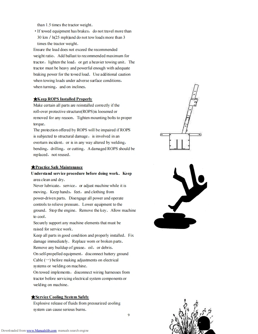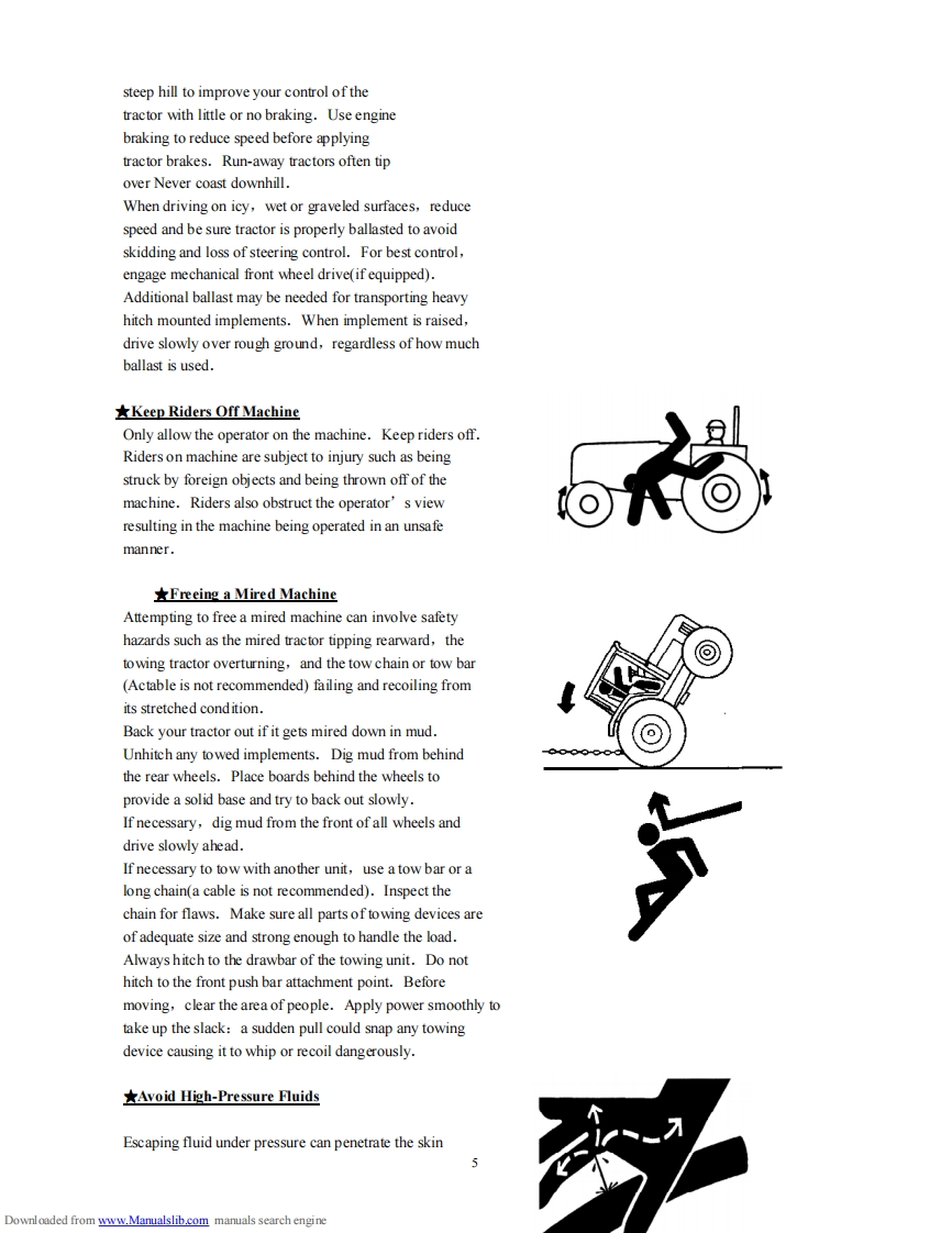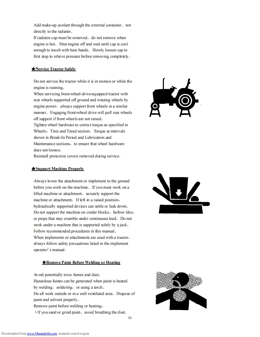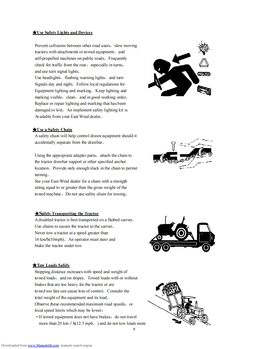 CONTENTS Service Manual 304G2SafetyPrecautionsAMEMEENANNEENENNE NENNEE N NN NANNE MN N AN M E NChapter IWork safely Always and safety Rules.....................14Chapter IlTechnical Specifications of the Tractor............................18Chapter IllRunning-in of the Tractor....23Chapter IVOperating the Tractor.25Chapter VAdjustments of the Tractor...................31Chapter VILubrication and Maintenance of the Tractor......................43Chapter VIlTroubles and Trouble-shooting......................47Appendix 1Moving Locus Diagram of Lifting Linkages.................................57Appendix 2Moving Locus Diagram of Lifting Linkages.................58Appendix 3Diagram of Electrical System Principle59Appendix 4ListofRubberOil-sealandO-ring60Seal.......................Appendix 5List of Bearings.…62Appendix 6Tightening Torque Table of Main Bolts and Nuts.......................63Appendix 7Optional Accessories...63Appendix 8List of Attached Tools..........64Appendix 9Packing65List..................................................里里里里1PRE-DELIVERY SERVICE.66Downloaded from www.Manualslib.com manuals search engine