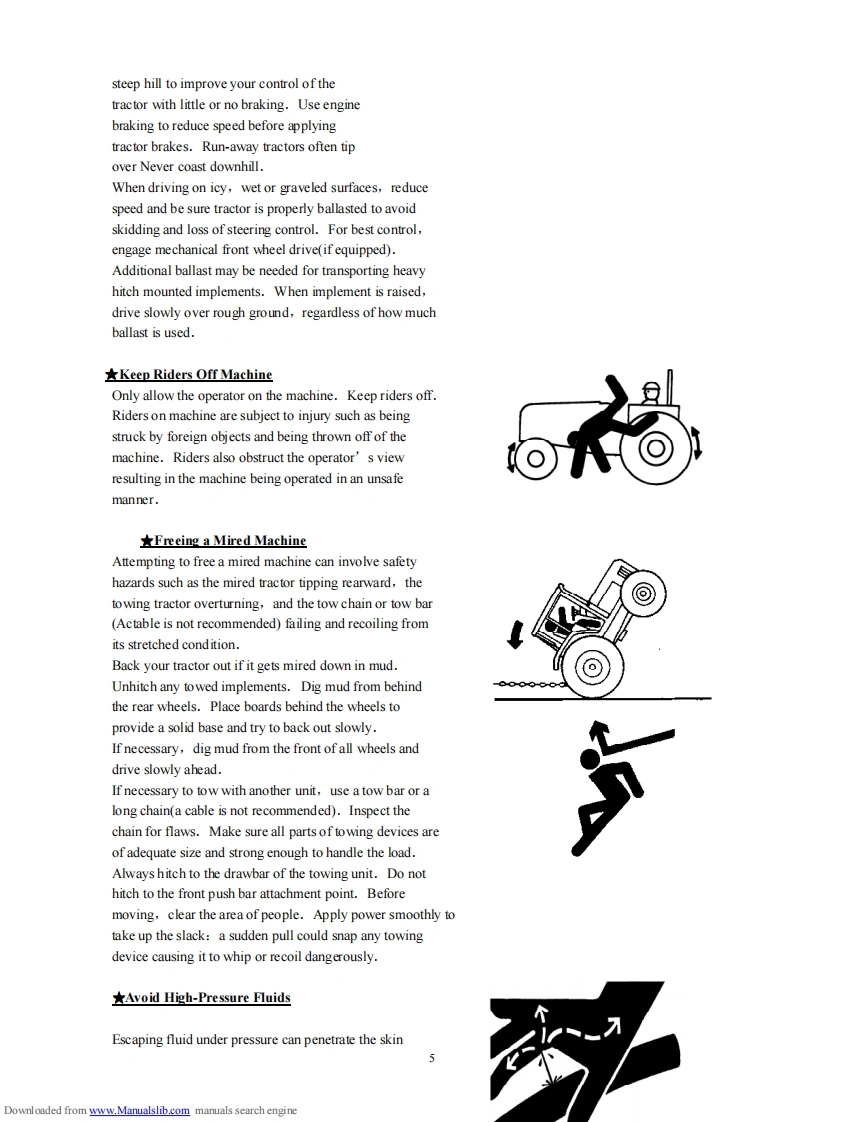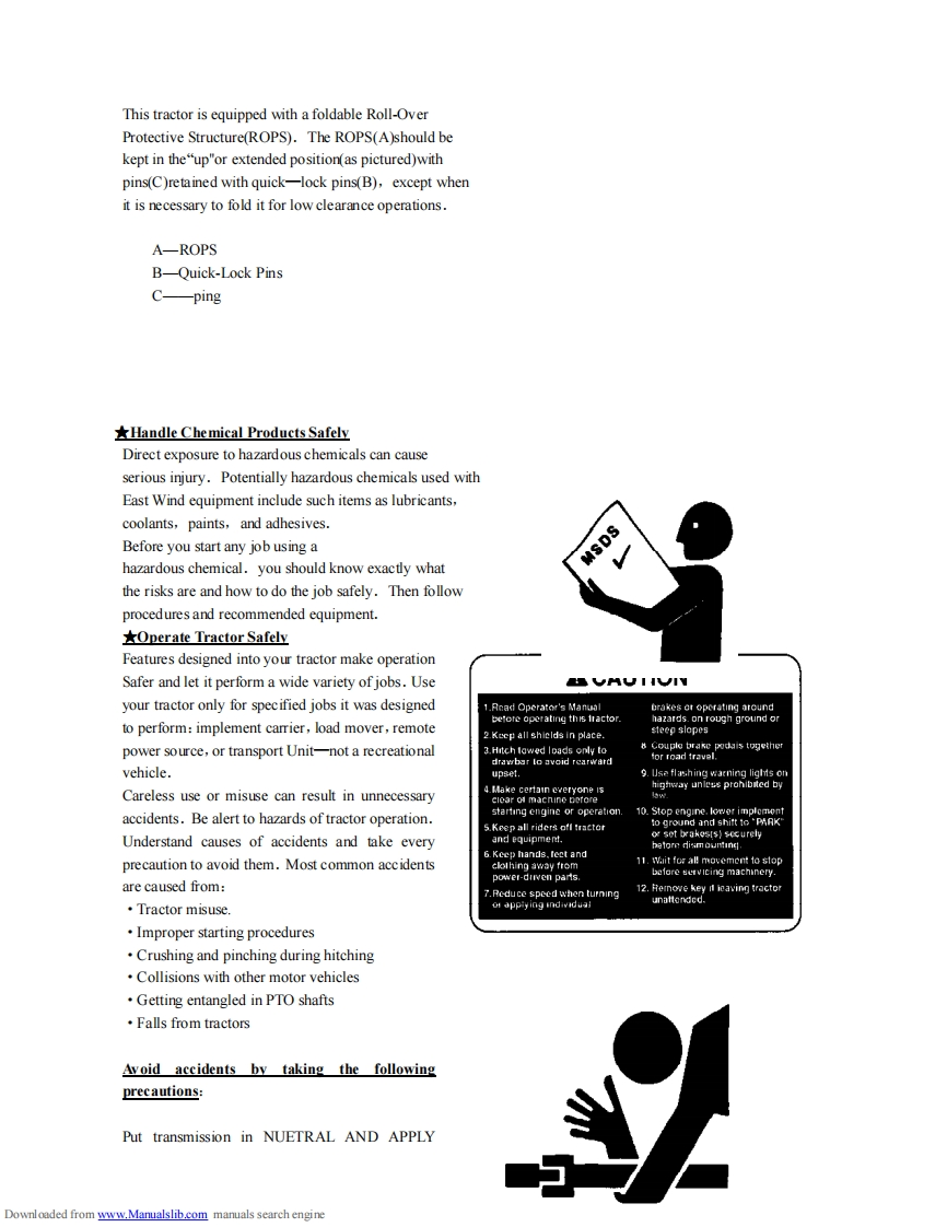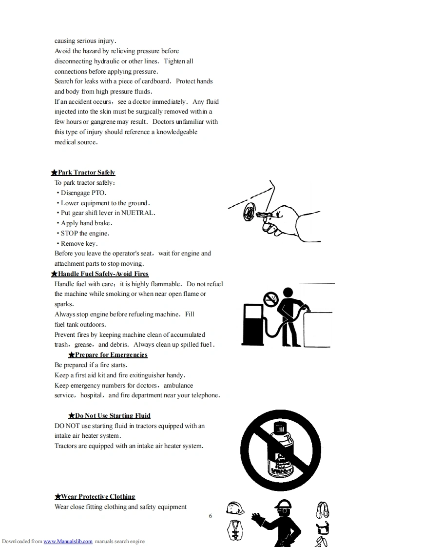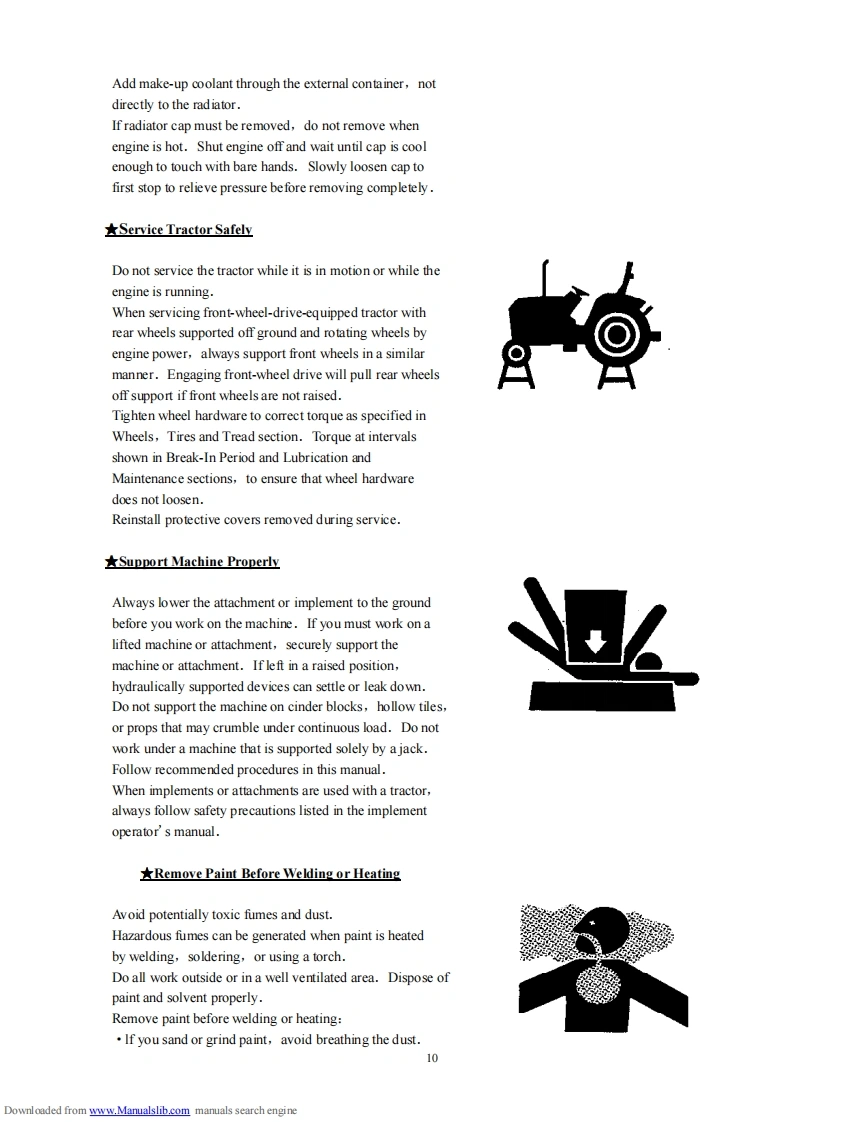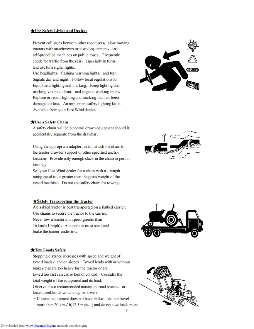 CONTENTS Service Manual 304G2SafetyPrecautionsAEMEENANNENNENAE NNNNEE N NNNANNE M EE N AN MChapter IWork safely Always and safety Rules .........................14Chapter IlTechnical Specifications of the Tractor..........................18Chapter IllRunning-in of the Tractor....23Chapter IVOperating the Tractor..25Chapter VAdjustments of the Tractor...................31Chapter VILubrication and Maintenance of the Tractor......................43Chapter VIlTroubles and Trouble-shooting......................47Appendix 1Moving Locus Diagram of Lifting Linkages.................................57Appendix 2Moving Locus Diagram of Lifting Linkages..................58Appendix 3Diagram of Electrical System Principle59Appendix 4ListofRubberOil-sealandO-ring60Seal.........................Appendix 5List of Bearings.………62Appendix 6Tightening Torque Table of Main Bolts and Nuts........................63Appendix 7Optional Accessories.63Appendix 8List of Attached Tools......……64Appendix 9Packing65List.”8a日8aPRE-DELIVERY SERVICE.66Downloaded from www.Manualslib.com manuals search engine