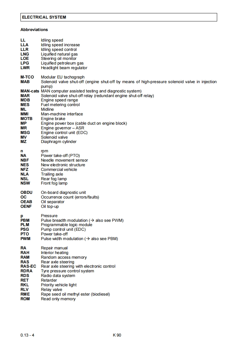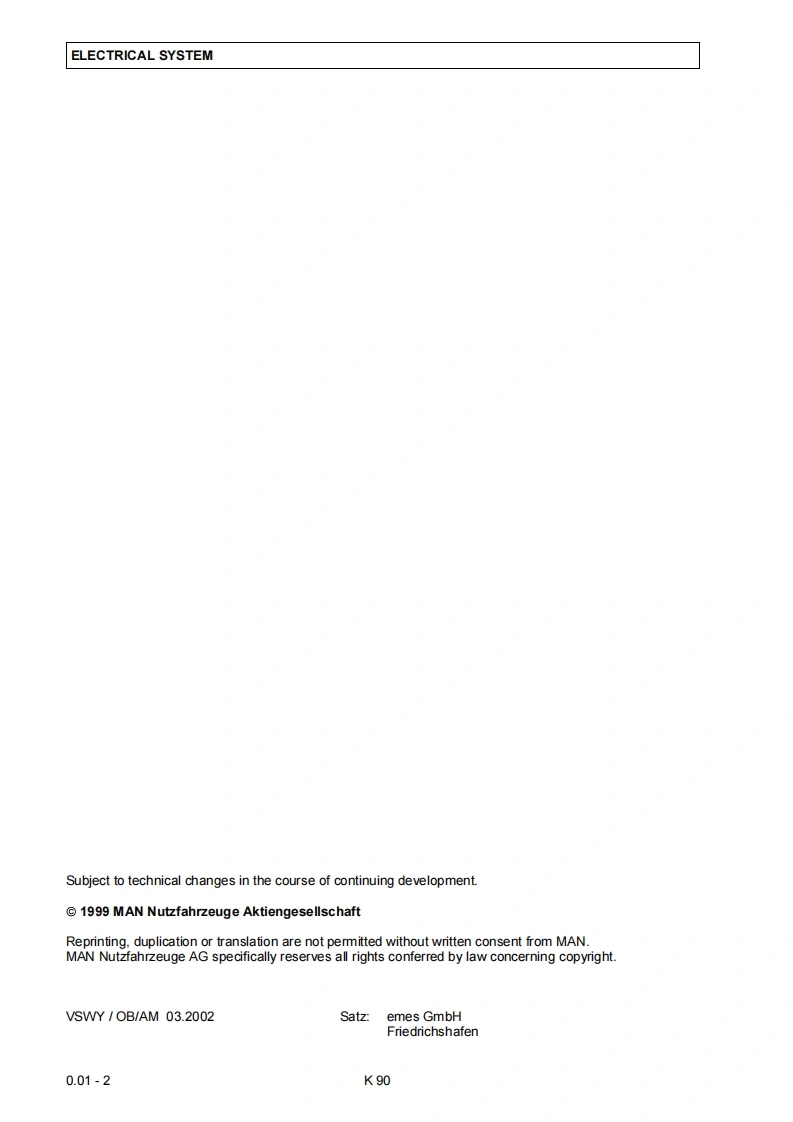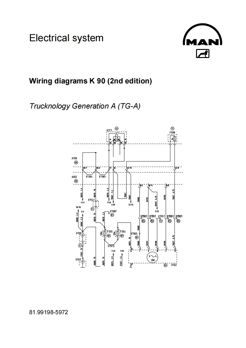 ×MAN④KElectrical systemTrucknology Generation A(TG-A)20021123415|6171819110111|12Publication no.:Wiring diagrams81.99198-59722nd Edition K 90MAN Nutzfahrzeuge AktiengesellschaftElektrische Anlage TG-ADachauer Str.667 oder Postfach 50 06 20Schaltplane K 90(2.Ausgabe)80995 MONCHEN80976 MUNCHENenglisch-Printed in Germany