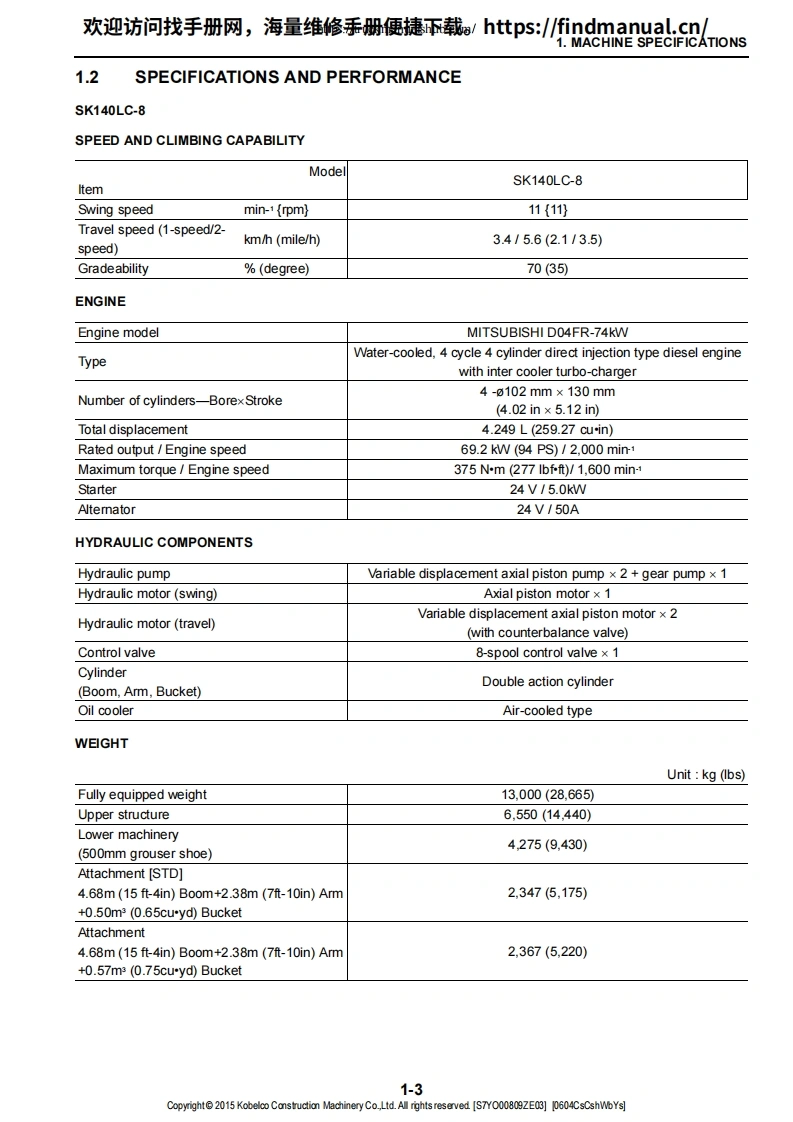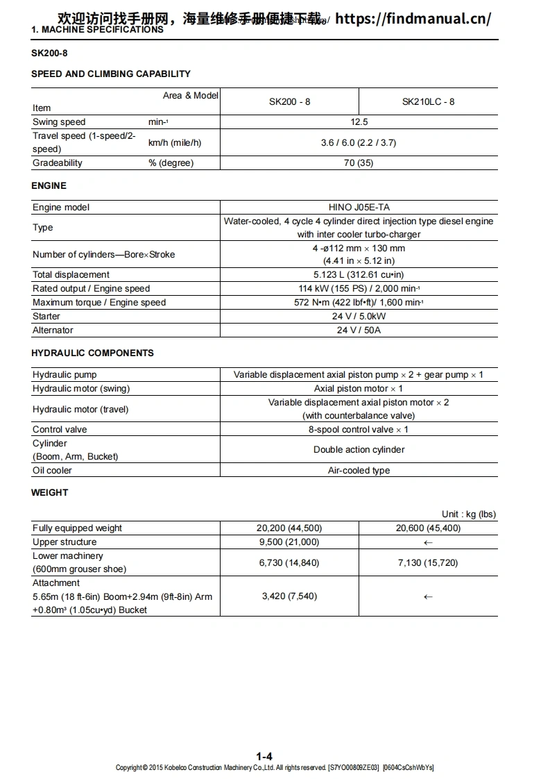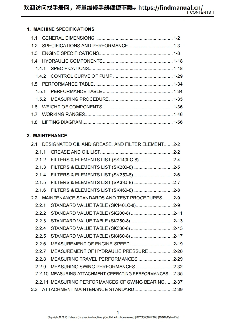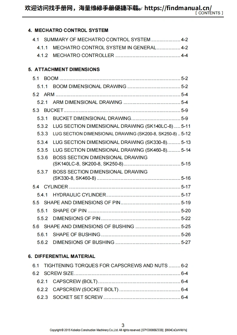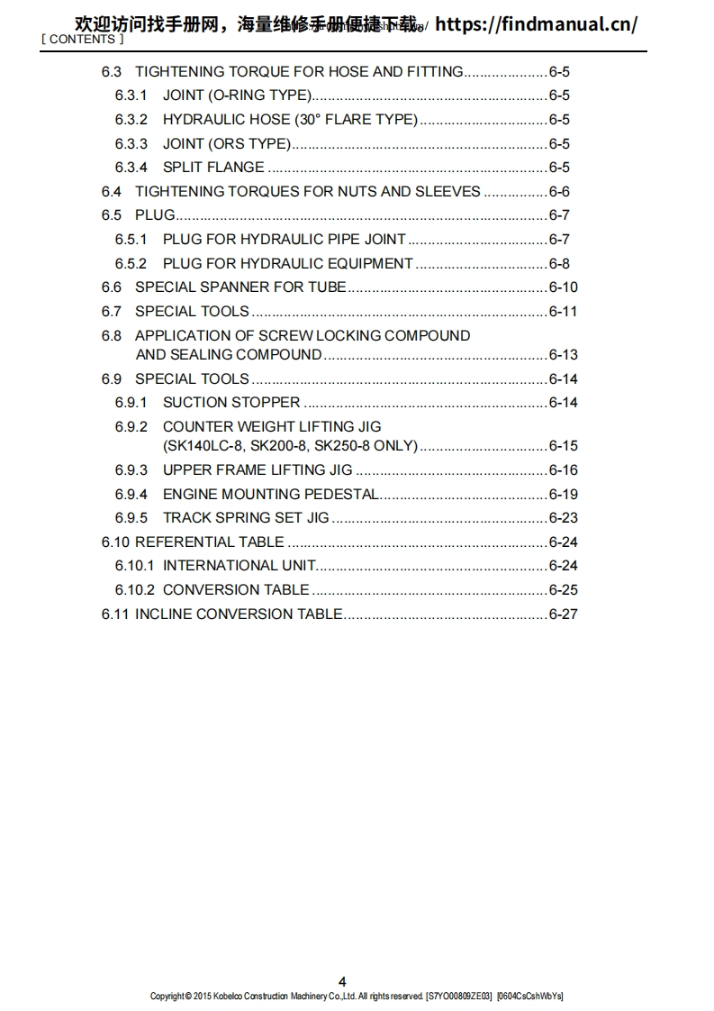 欢迎访问找手册网,海量维修手册便捷不载/https:/findmanual.cn/KOBELCOACERAGe.speCSERVICEMAN HANDBOOKSK140LC-8YP09-05001~SK200-8YN11-45001~SK210Lc-8YQ11-06001~SK250-8LQ12-06001~SK260Lc-8LL12-05001~SK330-8LC10-07001~SK350Lc-8YC10-03501~SK46▣-8LS10-02001~SK480Lc-8YS10-01501~KOBELCO CONSTRUCTION MACHINERY CO.,LTD.Book Code No.S7Y000809ZE03Printed in Japan 2014.09Copyright2015 Kobelo Construction Machinery Co.Ltd.All rights reserved.[STY0E]0604CsCshWbYs]