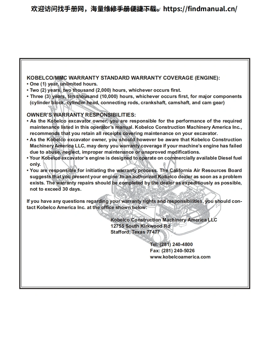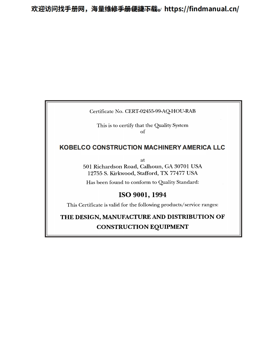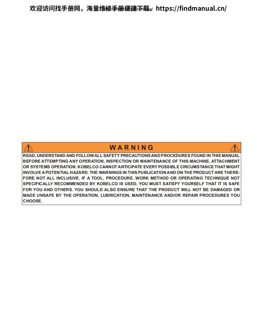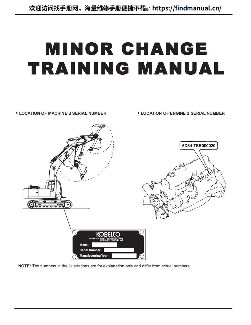 欢迎访问找手册网,海量维修手册便捷载:https:/findmanual.cn/(Minor Change)。。KOBELOSK210LcA论道0一00D0山女0000TRAININ©MATERIALSK160LC-6EYM03U0522-ED190-6EYL03U0136SK210LC-6EYQ08U0969-SK250LC-6ELL09U0575SK290LC-6ELB04U0298~SK330LC-6EYC07U0623-C2002 KOBELCO CONSTRUCTION MACHINERY AMERICA LLC,Calhoun,Georgia Stafford,Texas USA.All rights reserved.Any use ofeditorial or pictorial content is strictly prohibited withoutexpress written pemission from KCMA LLC Calhoun,Georgia/Stafford,Texas USA.Printed in USA(1102☑ISSUED:11/02;REV.0