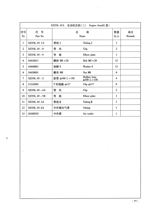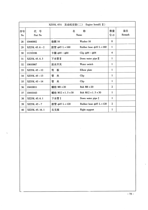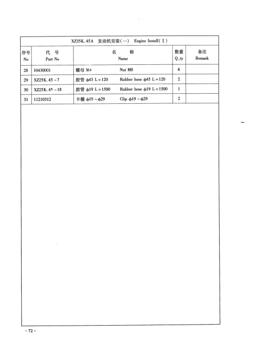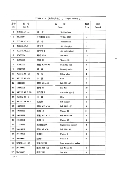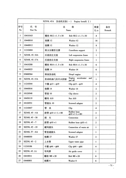 XZ25K.45.15A发动机油门和灭火控削Engine Aceelerator And Put Of序号代号名称数量备注NoPart NoNameQ.tyRemark110430009螺母M6Nut M63210440022垫圈6Washer 61310520004球饮Ball gemel14X725K.45.15-1氟杆Screw1510430004螺母M10Nut MI01610710027灭火汽缸Put e air eylinder110410125螺栓6×30BclM6×301810430001螺母M10Nut M82910520005球校Ball gemel11010440001转图8Washer 8111XZ25K45.15.2摆臂Swing ar12X725K45.15-4支果Support113X725K45.15.5款轴Soft shaft114XZ25K45.15.6软轴Soft shaft11510450056挡圈10Shield ring 101161141099%拉簧LⅢB1.2×14×82Pull back spring117X725K.45.15.3软轴总成Solt shaft169