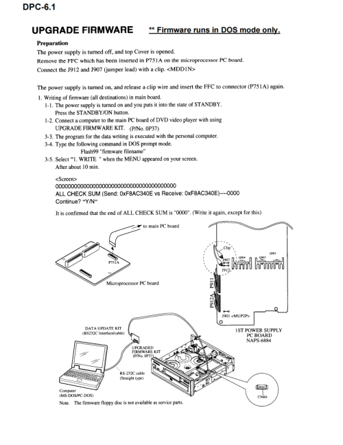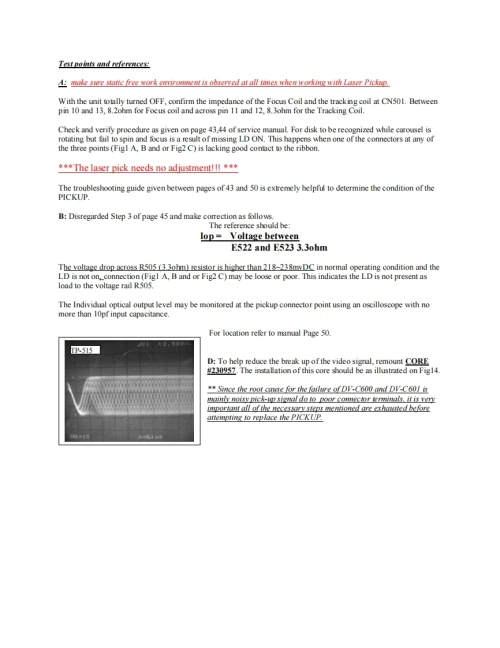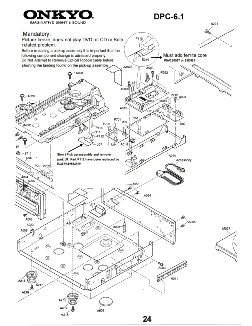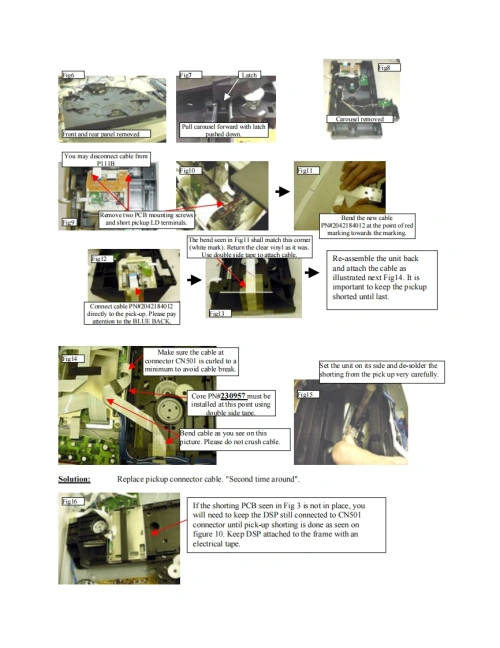 ONKYOFiral release date:01/27102DPC-6.1Ref112200-3Servise Tip and Troubeshootingikrc丘k eniromment is ohserred al oll timet who进ak星hLater PichupSvmptoms(1)Disk Starts,Spins and DISK ERROR comes up.(2)Disk plays with intermittent picture hreaking up.(3)Disk fuils to initialize,or locks up trying to read disk(4)Plays DVD but fails to play CD or plays CD but not DVD.Mandatory Solution:Replace pickupconnector cables.Remove pick-up connector imermediate PCB.updatefirmwree with most recent versionPart LocationOld Part numberNew part NumberReason For changeP11220421835122042184012Improved RF (Eye Pattem)P1112042180512Eliminated (Remove】RF Loss improvedU071H412554-2Elminated (Remove】RF Loss improvedE210None20957(AddRF Noise improvedBefore youstan wock the following pmsess mas be addressed in oner to ayoid damage to the pickuo assembby.Your finding may resemble the followingsPowers,rocates carousel chucks.(clamps)and LD is not ON.and immediately un-chuckbPowers,chucks,and L.D is on spins for a few seconds and unclamps goes to next disk.Powers,chucks,LD is on,spins and spins trying to read TOC.Endless loop.d.DVD plays but not CD or plays CD not DVD.e.Picture breakup problem.Access hole for shortingShort 019 win solderpk线p at the bo.L通cap wih a serewdsMun retumn cap when done.amd复起H