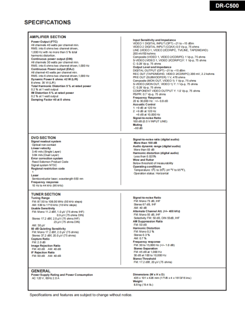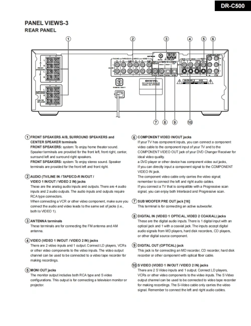 DR-C500Ref.No.3747ONKYO SERVICE MANUAL092002DVD CHANGER RECEIVERMODEL DR-C500包000nn25RC-508MBlack and Silver modelsBMDDIN120V AC.60HzSAFETY-RELATED COMPONENTWARNING!!COMPONENTS IDENTIFIED BY MARK ON THESCHIEMLATIC DLACRAMAND IN THIE PARTS LET ARECRITICAL FOR RISK OF FIREAND ELECTRIC SHOCKREPLACE THESE COMPONENTS WITH ONKYOPARTS WIOSE PART NUMIIERS APPEAR ASSIIOWNIN THIS MANUALMAk家I.AkA求-1H银ATOR划AN《重MEASUREMENTS TO DETERMINE THAT EXPOSEDPARTSARE ACCEPTAILY INSULATED FROM THEsPIY1T球RE球URNING THKAPPLLANCE TOTHE CUSTOMERONKYOIMAGINATIVE SIGHT SOUND