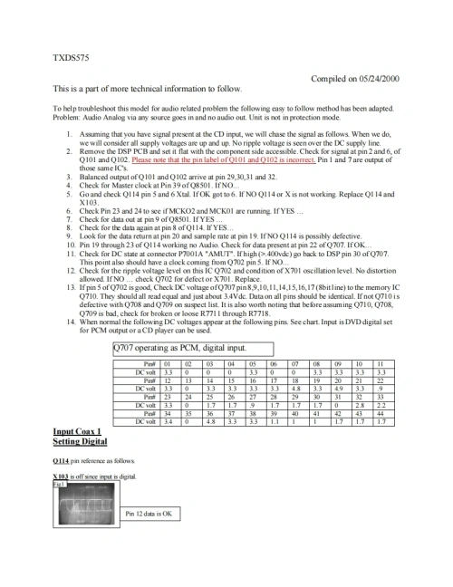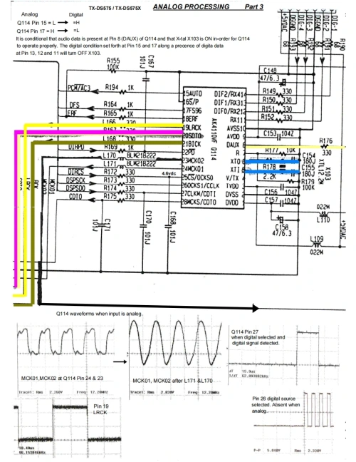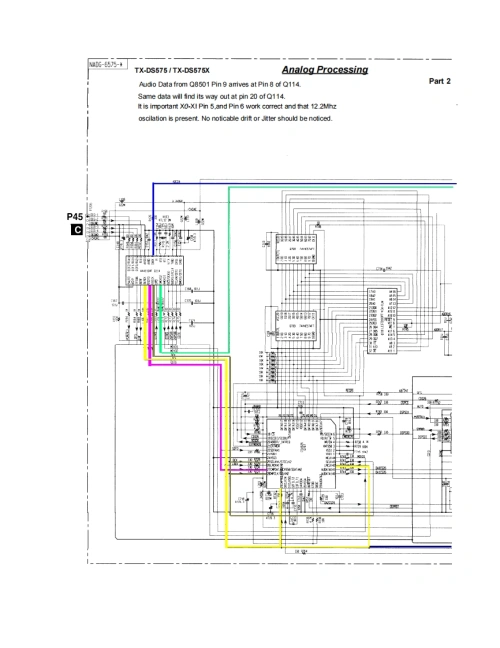 ONKYOPart 1TX-DS575/TX-DS575XAnalog ProcessingPin 31 and 32 balanced input for Right chamel(RED Pin 29 and 30 balanced inout for Left channel (GREEN)C8501 have combinstion of ADC and DAC.Pin 29-32 are balanoed inputs to ADC.Intemaly the aralg signalgoes through High Pass Limiter before it is clocked to LR outaster Clock MCK02sm线available from黄Ph39.Sorc86fMC×0叹sQ114Pin 9 provides a serial audo data ouput derived from the analog inputs 29-32 whose data rate is dependant onUR Cbo atP叫n58 nd Maste白ock at Pi39.The UR dock and Serial Data m时y look a地except Pn9 has data ncorpoarted within the LR dock.Pn9 ris dat情larrive剩Q1i4碳Pin8The anabg stcal mat goes in Pn 29-32 does notQ101 servicis as irering ampifera2酸n9h29tPm22-28ee星While Q102 non inverting.Note comectiorEAha进f地h回PDe5型b2On PN56
