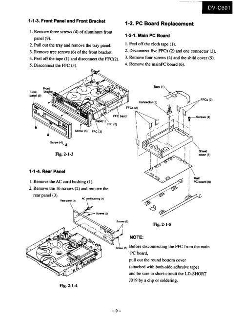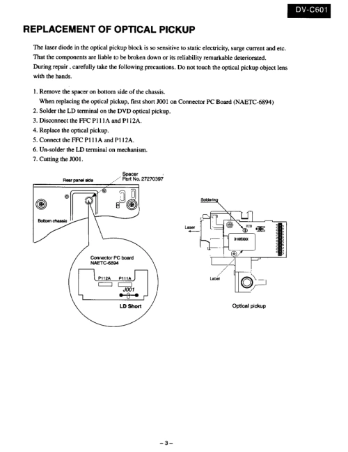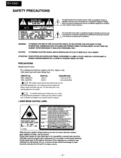 DV-C601Ref.No.3657ONKYO.SERVICE MANUAL072000DVD CHANGERDV-C601BMDDIN120V AC.60HzBMUP2P100-240WC,506aHzSAFETY-RELATED COMPONENT WARNING!ITABLE OF CONTENTSSafety precautionsCOMPONENTS IDENTIFIED BY MARK ON THEReplacement of opeical pickup2SCHEMATIC DIAGRAMAND IN THE PARTS LIST ARESpecificationsFront panel/Rear panel viewCRITICAL FOR RISK OF FIRE AND ELECTRIC SHOCK.45Desplay view-REPLACE THESE COMPONENTS WITH ONKYORemote controller viewPARTS WHOSE PART NUMBERS APPEAR AS SHOWNReplacement of mechanism8Mechanism view/Parts listIN THIS MANUAL15Upg金mwa-Microprocessor terminal description16Printed circuit board parts list-MAKE LEAKAGE-CURRENT OR RESISTANCEExploded view/Parts list-20MEASUREMENTS TO DETERMINE THAT EXPOSEDPC Board view (Power supply section)31PARTSARE ACCEPTABLY INSULATED FROM THESchematic diagram (Power supply section)3SUPPLY CIRCUIT BEFORE RETURNING THEPC Board view (Microprocessor/Display section)-35Schematic diagram (Video amplifier section)APPLIANCE TO THE CUSTOMER.PC Board view (Output terminal section)-Schematic diagram(Output terminal section)PC Board view (Video amplifier section)443Schematic diagram (Microprocessor/Display section)Main PC board view4PC hoard comnection diagramONKYO。ICs block diagrm5Block diagram3Packing view/Parts list5AUDIO COMPONENTS-1