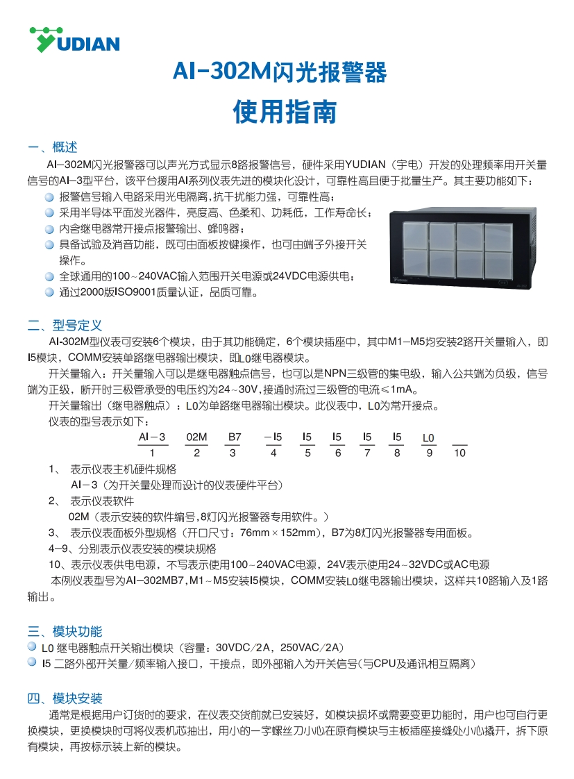 UDIANA1-302M闪光报警器使用指南一、概述A一302M闪光报警器可以声光方式显示8路报警信号,硬件采用YUDIAN(宇电)开发的处理频率用开关量信号的A一3型平台,该平台援用A系列仪表先进的模块化设计,可靠性高且便于批量生产。其主要功能如下:○报警信号输入电路采用光电隔离,抗干扰能力强,可靠性高;○采用半导体平面发光器件,亮度高、色柔和、功耗低,工作寿命长;○内含继电器常开接点报警输出、蜂鸣器;○具备试验及消音功能,既可由面板按键操作,也可由端子外接开关操作。○全球通用的100~240VAC输入范围开关电源或24VDC电源供电;○通过2000版S09001质量认证,品质可靠。二、型号定义A1-302M型仪表可安装6个模块,由于其功能确定,6个模块插座中,其中M1-M5均安装2路开关量输入,即5模块,COMM安装单路继电器输出模块,DL0继电器模块。开关量输入:开关量输入可以是继电器触点信号,也可以是NPN三级管的集电级,输入公共端为负级,信号端为正级,断开时三极管承受的电压约为24~30V,接通时流过三级管的电流≤1mA。开关量输出(继电器触点):L0为单路继电器输出模块。此仪表中,L0为常开接点。仪表的型号表示如下:Al-302MB7-515151515LO2345678901、表示仪表主机硬件规格A!一3(为开关量处理而设计的仪表硬件平台)2、表示仪表软件02M(表示安装的软件编号,8灯闪光报警器专用软件。)3、表示仪表面板外型规格(开▣尺寸:76mm×152mm),B7为8灯闪光报警器专用面板。4-9、分别表示仪表安装的模块规格10、表示仪表供电电源,不写表示使用100-240VAC电源,24V表示使用24-32VDC或AC电源本例仪表型号为Al-302MB7,M1~M5安装5模块,COMM安装L0继电器输出模块,这样共10路输入及1路输出。三、模块功能○L0继电器触点开关输出模块(容量:30VDC/2A,250VAC/2A)○5二路外部开关量/频率输入接口,干接点,即外部输入为开关信号(与CPU及通讯相互隔离)四、模块安装通常是根据用户订货时的要求,在仪表交货前就已安装好,如模块损坏或需要变更功能时,用户也可自行更换模块,更换模块时可将仪表机芯抽出,用小的一字螺丝刀小心在原有模块与主板插座接缝处小心撬开,拆下原有模块,再按标示装上新的模块。