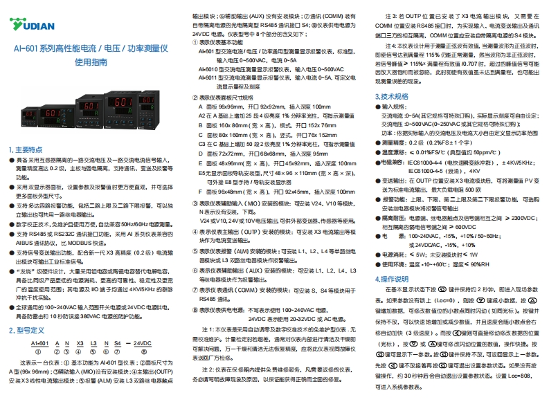 输出模块:®罐助城出(U闪设有安装模块:⑦遥讯(COMM装有注3若OUTP位置已安装了X3电流罐出模快又霜要在UDIAN自带隔离电酒的光电隔离亚RS4明5遇讯摇口S4:圆仪表供电电液为COMM位置安装RS45接口时,为买现输入,电流变送出及遥讯24VDC电酒。仪表里号中8个宦分的含义如下:口三方的相互深魂,COMM位置应安装自带隔离电要的S4模快。①表示仪表基本功美A601系列高性能电流/电压/功率测量仪注女本仪表设计用于量正盛泼有数值,当观量泼形为正蓝泼时,A801型交流电流/电压/功军通用型测量显示报置仪表,标在亚,灯使信号达到两量程115%仍彬正常测量,然当泼形为辈正蓝波时,使用指南猪入电压0-500wC,电流0-5A若信号情值>115%x满量程有效值0.707时,超过的情值信号可能A6010型交流电旺测量显示报警仪表,输入电压0500VAC因成大墨恒和需被忽略,此时灯使有双值重末达到两量程,也可能出仙6的11亚交流电流测量显示报警仪表,缩入电流05A可定义电现魂量递的现象。流显示量程及划夏602表示仪表面板尺寸规格3,技术规格50A三板9696mm,开▣9292mm,插入100mm●核入规格:601A2在A型上增加25段4级亮复1%分和率光柱,可指示测量值交流电流小5W其它规格可特们羽),实豆示知竖可自由设定:B三板1880mm(宽×喜),惯式开015276m交流电旺0-500w4C(02504C或耳它规格可骑殊订明上C板80160mm(宽×喜).妥式,开076152mm功率:依据实际罐入的变电压及电流大小增由定义豆示功率范里C3在C四上塔加50段2级壳竖1%分率光柱,可指示测量值●测量精度:02级(0.2%FS士1个字)1,主要特点D日板72z72mm,开口6868mm,插入经95mm●湿度漂移:<0.01%FS℃(更型值约50ppm/c)●具备采用互感恐隔离的一路交流电压及一路交流电流信号罐入,E日板48x8mm宽×喜),开口4592mm,插入深竖100mm●电磁箱:E031000+4(电快漂变歌冲),主4050z:测量精度达02级,主板与器电%离,持遥讯、变送及报馨等E5无豆示三板号轨安装亚,尺寸48×96×110mm宽×高×深),E03100045(浪涌),43V功能。可外接E8型手持/导轨安装显示器●变运藕出:在OUTP位置安装X3电流模快后,可格观量值PV变●采用双显示器三板,设置参数及报罂值时里万使直现,并可选挥送为标难电流猪出,限大负电阻500欧更多板外瘦尺寸。F但板9648mm(宽×喜h开口925mm,插入深竖100mm3表示仪表某助辅入(M0)安装的模块安装V24,V10等模块,●毅置功修:上限、下限、第二上限及第二下限报警功能可选羽●支持多达四路报馨功彬,包括二路上限及二路下限报鉴,可以独安装电忍模快将报置店号缆出立结出也可供用一路堂电出。N表示设有安装,下可。●隔离耐压:电源选、继电忍触点及信号继相互之间≥2300DC:●数字校正技术,免堆护祖使用方便,自动莱客0z80:世观量。V24或V10,24V或10V电压出可供外变送墨.传感图等使用相互隔离的保电店号之恒360DC●支持RS485或RS232C遥讯接口功整,采用N系列收表莱客的④表示仪表主辅出(0UP)安装的板块:可安装X3电罐出等模AIBUS遥讯协议,比MODBUS快速。快作为电流变送出。●电差:100-240AC,15%.+10%/5060t:求24 VDCIAC,15%,+10%●支持号变送城出功能,配合新一代X3精竖(02级)电流耀5表示仪表誓(M安的板块:可安装L1、2,L4等单路电●电源消耗:≤5W州:未安模快时<1W出模快可出工业标雄店号块城3路堂电忍模块作报罂猛出。●使用环境:温竖,10+60℃:湿竖<90%RH●“发烧”级证件般计,大量紧用日电容图受电客形代电电客,6表示仪表韩助塘出()安装的模块:可安装L1,L2,4、3具备比可级产品更低的电消耗、更喜的可惯性。糙定性及更宽等盘电墨模快作报馨雅出。4,操作说明广厂的温竖使用范重:其电语及0满子园遇过450Hz的款⑦表示仪表通讯(COWW)安装的授块:可安装S、S4等模块用于在基本显示状态下棱)键井保持的2秒钟,即进入现场参数冲抗干扰验。RS485遥讯。表。如果参设有锁上(L口c=0),则披@键减小数据,按④●全适用的100240心VC犹入花开关电源或24VDC电共电.8示仪表供电电源不写表示用10024VAC世源,量增加数据,可改数值位的小数点可时闪动(如可光标)。按键井具备防雷击和10秒防识接380VAC电的护功彬。24VDC表示睫用2032DC或C电著。保持不成,可以快速地塔加或减少数值,井且速竖台题小数点合右2.型号定义注1:本仪表是紧用自动调零及数难技术的免雉护型仪表,无移自动加快(3级速竖)。西按①可直接移动改数把的位置A1-801AN334兰-24DC霜校连雄护。计量检定时若起差,遥常对仪表内盛进行清洁及干根即(光标),按@或④理可修改闪动恤置的数值,提作快捷。按①②③④⑤⑤®可蒂闲问题,万一干樱清洁无法板显精复,应格此仪表视可仪表送亚厂万检格。)键可豆示下一参数。按句键并保持不成,可返亚豆示上一参数。这表示一台仪表:①基本功能为N601型仪表:②日板尺寸为先按①键不政接着再按)量可退出设置参数状态。如果没有按A型(98数96m刊:C屏城入(MO)没有安装模块:④主猪出(OUTP刊注2:仪表在保修形内提供免费雉格服务,凡需要返将的仪表】安装X3线性电流琉出模块:⑤报警A山0安装L3双路堂电忍触点务心请马明故障现像及原因,以保证战获得正确酒全的郴短。量提作,约30利钟后合自动退出1设置参数状态。设置L0G808,可进入系统参数表。