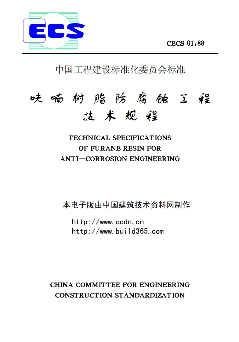 ECSCECS 01:88中国工程建设标准化委员会标准呋喃树脂防腐触三程技术规程TECHNICAL SPECIFICATIONSOF FURANE RESIN FORANTI-CORROSION ENGINEERING本电子版由中国建筑技术资料网制作http://www.ccdn.cnhttp://www.bui ld365.comCHINA COMMITTEE FOR ENGINEERINGCONSTRUCTION STANDARDIZATION