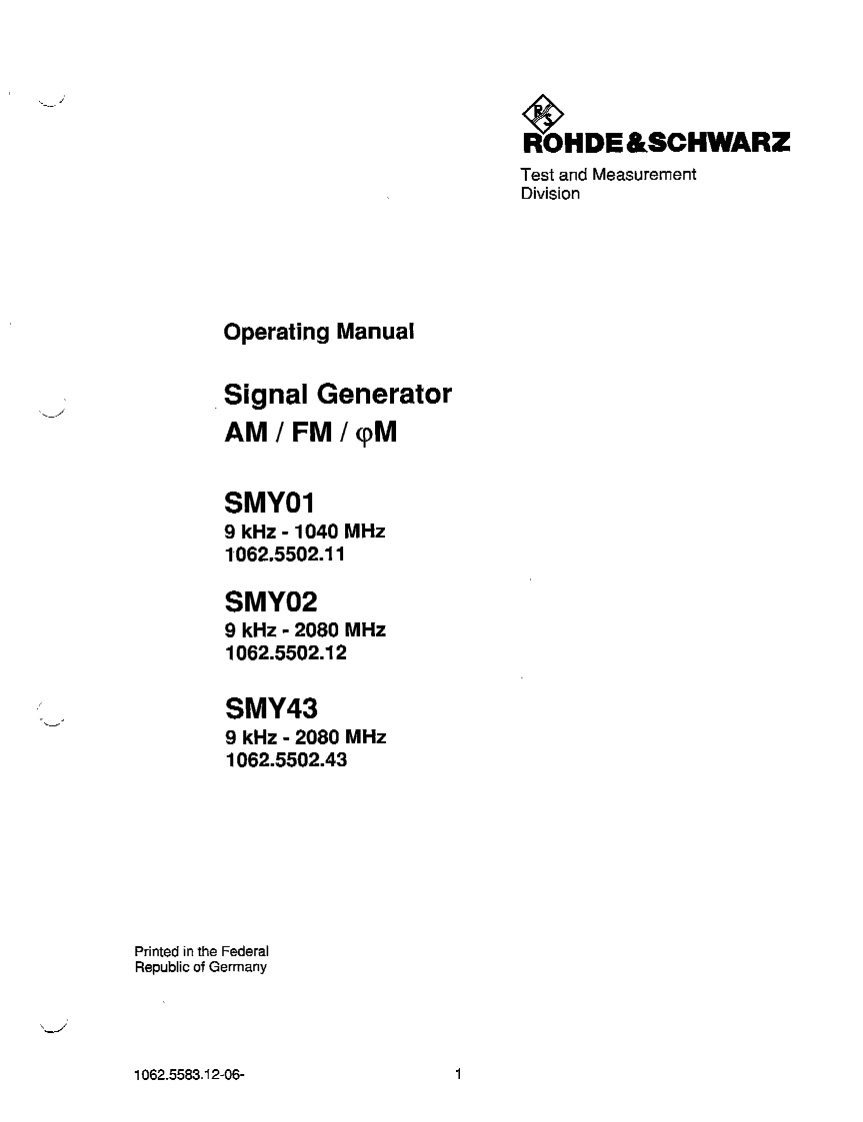 八ROHDE&SCHWARZTest and MeasurementDivisionOperating ManualSignal GeneratorAM/FM/OMSMY019 kHz 1040 MHz1062.5502.11SMY029 kHz 2080 MHz1062.5502.12SMY439 kHz -2080 MHz1062.5502.43Printed in the FederalRepublic of Germany1062.5583.12-061
