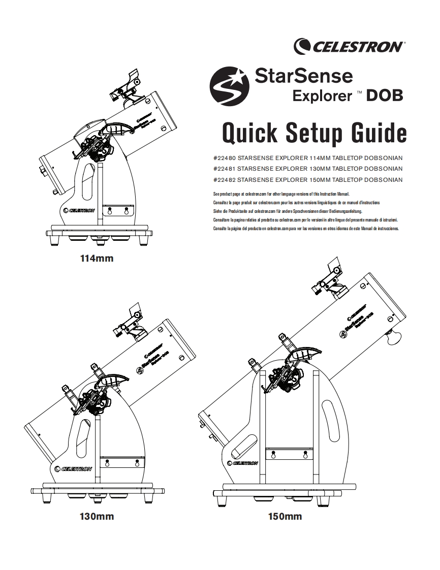 ●CELESTRONStarSenseExplorer T DOBQuick SetupGuide#22480 STARSENSE EXPLORER 114MM TABLETOP DOBSONIAN#22481 STARSENSE EXPLORER 130MM TABLETOP DOBSONIAN#22482 STARSENSE EXPLORER 150MM TABLETOP DOBSONIANCanstez a page produit sur celestmcmpurles autres versians linguis fiques de ce manue dinstucfions88交e de Produktsauf上sirocon fur andere Sprac中siBedienungsangConstare la pagina relativadsenmperle versianiin re lingue delpresntemaue d isiruioni.Cons la pigina时Pmdc如ng上tron.com gara ver las versianes en如sidomas de este Manual由inst114mm8QeQ屋0W130mm150mm