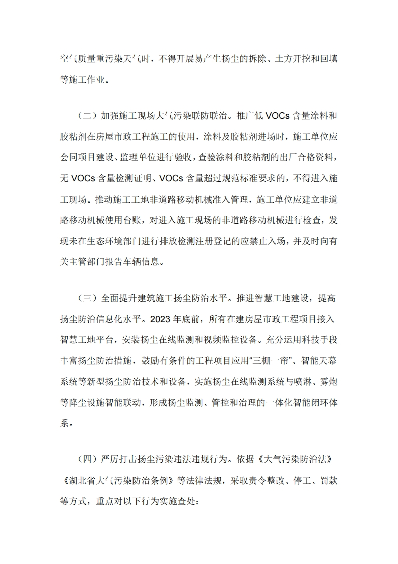 湖北省房屋市政工程大气污染防治工作方案为深入学习贯彻习近平生态文明思想,全面贯彻党的二十大精神和省十二次党代会精神,根据《湖北省大气污染防治“三大”标志性战役和“六大”攻坚提升行动计划》涉及建设工程领域的工作任务,特制定本方案。一、工作目标全面落实房屋市政工程领域大气污染防治措施,推进实施大气污染源头治理和扬尘污染综合治理攻坚提升,到2025年,全省房屋市政工程扬尘在线监测率达到100%,房屋市政工程领域全面推广使用低VOCs含量的涂料和胶粘剂,施工现场“防污、控污、减污、治污”水平显著提升,坚决贯彻党的二十大作出的“持续深入打好蓝天保卫战,基本消除重污染天气”重要战略部署。二、工作任务(一)落实建筑施工扬尘防治各项措施。强化建筑施工扬尘污染防治要求,严格落实扬尘污染防治“六化”措施,规范施工现场围挡、道路硬化、冲洗设施、裸土覆盖、渣土清运、土方开挖等施工管理。鼓励施工单位在道路、围墙等部位安装喷淋或喷雾装置。遇有4级以上风力或
