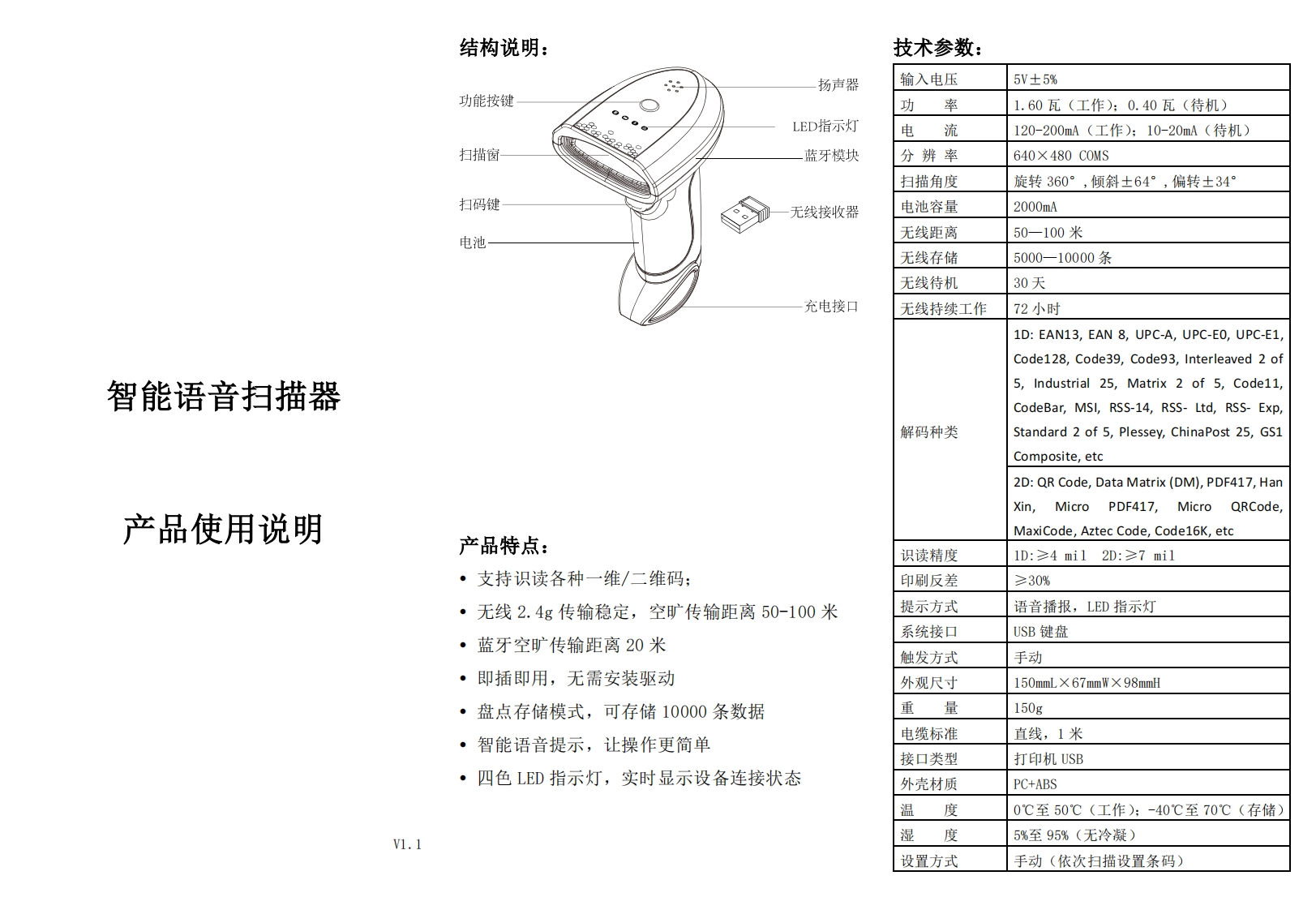 结构说明:技术参数:扬声器输入电压5V±5%功能按键功率1.60瓦(工作):0.40瓦(待机)LED指示灯电流120-200mA(工作):10-20mA(待机)扫描窗蓝牙模块分辨率640×480C0MS扫描角度旋转360°,倾斜±64°,偏转±34°扫码键无线接收器电池容量2000mA无线距离50一100米电池无线存储5000一10000条无线待机30天充电接口无线持续工作72小时1D:EAN13,EAN 8,UPC-A,UPC-EO,UPC-E1Code128,Code39,Code93,Interleaved 2 of智能语音扫描器5,Industrial 25,Matrix 2 of 5,Code11,CodeBar,MSI,RSS-14,RSS-Ltd,RSS-Exp解码种类Standard 2 of 5,Plessey,ChinaPost 25,GS1Composite,etc2D:QR Code,Data Matrix(DM),PDF417,HanXin,Micro PDF417,Micro QRCode,产品使用说明MaxiCode,Aztec Code,Code16K,etc产品特点:识读精度1D:≥4mi12D:≥7mi1·支持识读各种一维/二维码:印刷反差≥30%·无线2.4g传输稳定,空旷传输距离50-100米提示方式语音播报,LED指示灯系统接口USB键盘·蓝牙空旷传输距离20米触发方式手动·即插即用,无需安装驱动外观尺寸150mmL×67mmWX98mmH·盘点存储模式,可存储10000条数据重量150g电缆标准直线,1米·智能语音提示,让操作更简单接口类型打印机USB·四色LED指示灯,实时显示设备连接状态外壳材质PC+ABS温度0℃至50℃(工作):-40℃至70℃(存储)V1.1湿度5%至95%(无冷凝)设置方式手动(依次扫描设置条码)