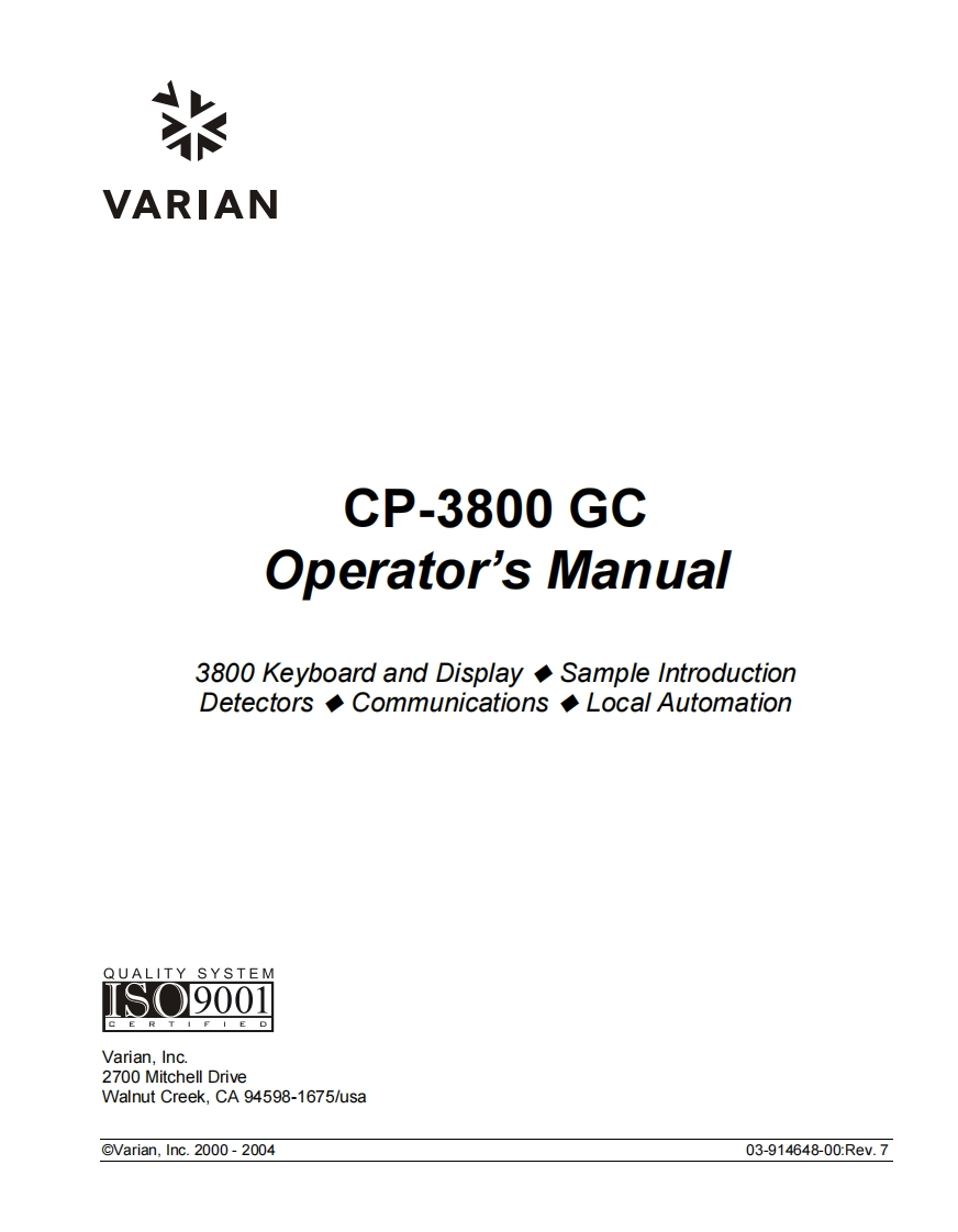 米VARIANCP-3800 GCOperator's Manual3800 Keyboard and Display Sample IntroductionDetectors Communications Local AutomationQUALITY SYSTEMISO9001C E R T I F I E DVarian,Inc.2700 Mitchell DriveWalnut Creek,CA 94598-1675/usa@Varian,Inc.2000-200403-914648-00:Rev.7