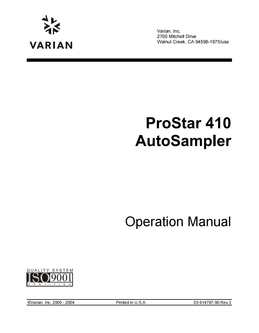 米Varian,Inc.2700 Mitchell DriveVARIANWalnut Creek,CA 94598-1675/usaProStar 410AutoSamplerOperation ManualQUALITY SYSTEMISO9001E@Varian,Inc.2000-2004Printed in U.S.A.03914787-00:Rev.3