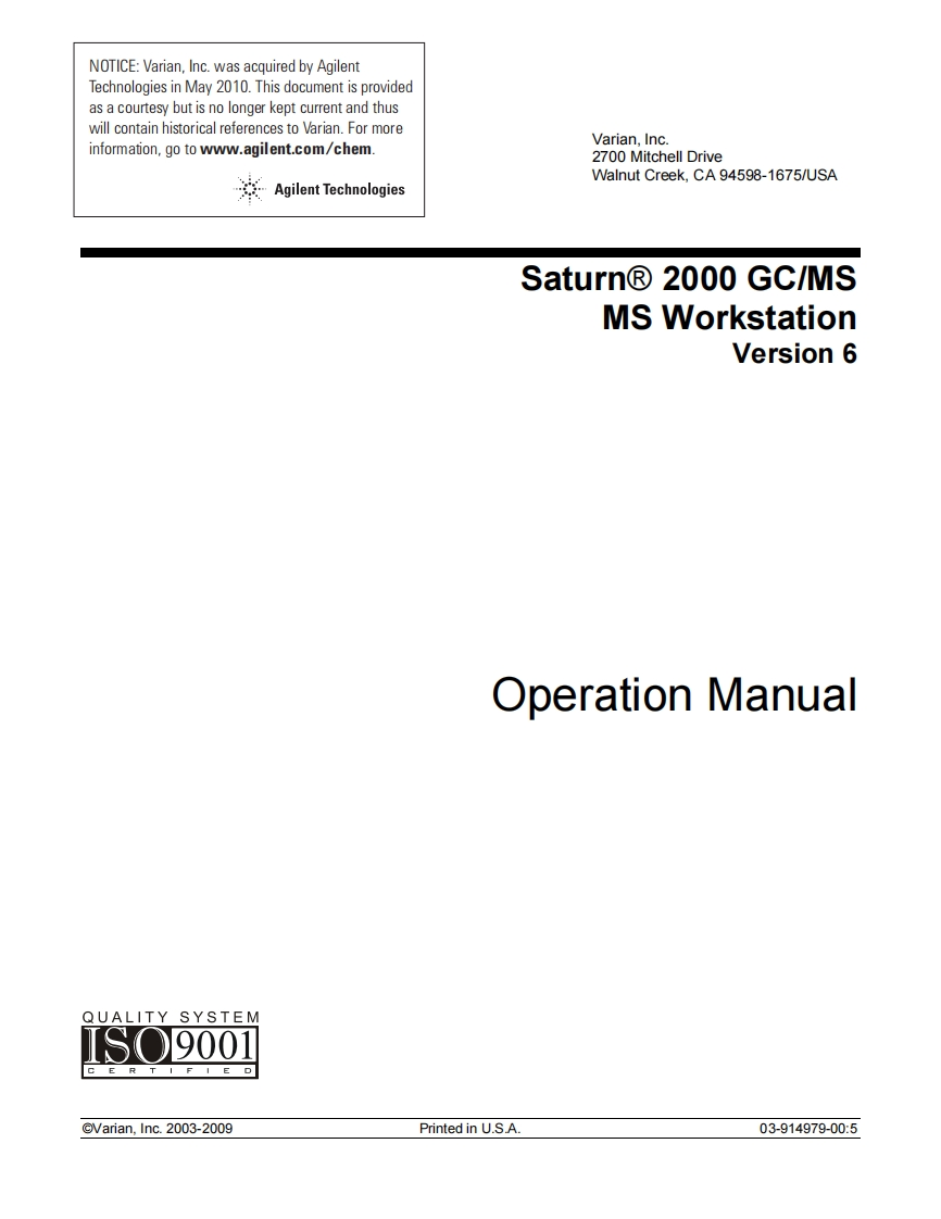 NOTICE:Varian,Inc.was acquired by AgilentTechnologies in May 2010.This document is providedas a courtesy but is no longer kept current and thuswill contain historical references to Varian.For moreinformation,go to www.agilent.com/chemVarian,Inc.2700 Mitchell DriveWalnut Creek,CA 94598-1675/USAAgilent TechnologiesSaturn®2000Gc/MSMS WorkstationVersion 6Operation ManualQUALITY SYSTEMISO9001@Varian,Inc.2003-2009Printed in U.S.A.03-914979-00:5