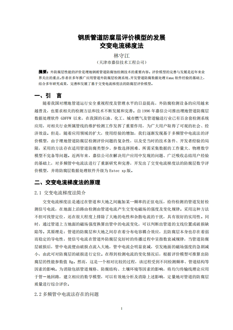 钢质管道防腐层评价模型的发展交变电流梯度法林守江(天津市嘉信技术工程公司)摘要:外防腐层性能的评价是埋地钢质管道防腐蚀检测技术的重要内容。评价模型的完普与发展是近年来业界关注的重点.作者在多年推广应用管道外防腐层检测系统、开发管道防腐数据处理E心软件经验的基础上,结合多年研究成果,完普和发展了基于交变电流梯度法的防腐层评价模型。一、引言随着我国对埋地管道运行安全重视程度及管理水平的日益提高,外防腐检测设备的应用越来越普及,也要求相关的检测方法和技术不断发展和完善。自1996年嘉信公司推出埋地管道防腐层数据处理软件GDF℉W以来,在我国的石油、化工、城市燃气及管道输送行业已有百余套检测系统应用,对相关行业所属管线的维护检测工作发挥了重要作用,为广大用户取得了可观的社会、经济效益。但是,随着应用领域的扩大,使用经验的增加,我们逐渐发现基于多频管中电流法的评价模型,由于埋地管道防腐层检测评价问题的复杂性,以及受当时的技术条件、开发者经验的局限,采用的方法存在适用管道防腐类型少、参数选择困难、所需采集数据的工作量大、物理数学模型不完备等问题。近两年来,嘉信公司在解决用户应用中发现的问题、广泛吸收总结用户经验的基础上,对多频管中电流法进行了重新研究和完善,开发出了交变电流梯度法的防腐层数学评价模型,并将防腐层数据处理软件升级为Estec xp版。二、交变电流梯度法的原理2.1交变电流梯度法简介交变电流梯度法是通过在管道和大地之间施加某一频率的正弦电压,给待检测的管道发射检测信号电流,在地面上沿路由检测由管道电流产生交变电磁场的强度及变化规律。采用这种方法不但可找管定位,还在很大程度上排除了大地的电性和杂散电流的干扰,具有很好的实用性。同时,通过管道上方地面的磁场强度换算出管中的电流变化,可以判断出管道的支线位置或破损缺陷等。其原理是:管道的防腐层和大地之间存在着分布电容耦合效应,且防腐层本身也存在着弱而稳定的导电性,使信号电流在管道外防腐层完好时的传播过程中呈指数衰减规律,当管道防腐层破损后,管中电流便由破损点流入大地,管中电流会明显衰减,引发地面的磁场强度的急剧减小,由此可对防腐层的破损进行定位。在得到检测电流的变化情况后,根据评价模型可推算出防腐层的性能参数值Rg。然而,这是一个相对比较的过程,该过程受到不同检测频率、管道结构等因素的影响。为消除包括管道规格、防腐结构、土壤环境等因素的影响,将均匀传输线理论应用于管一地回路,建立相应的数学模型,可以有效地分析及消除上述影响,定量地对管道的防腐层质量进行综合评价。2.2多频管中电流法存在的问题
