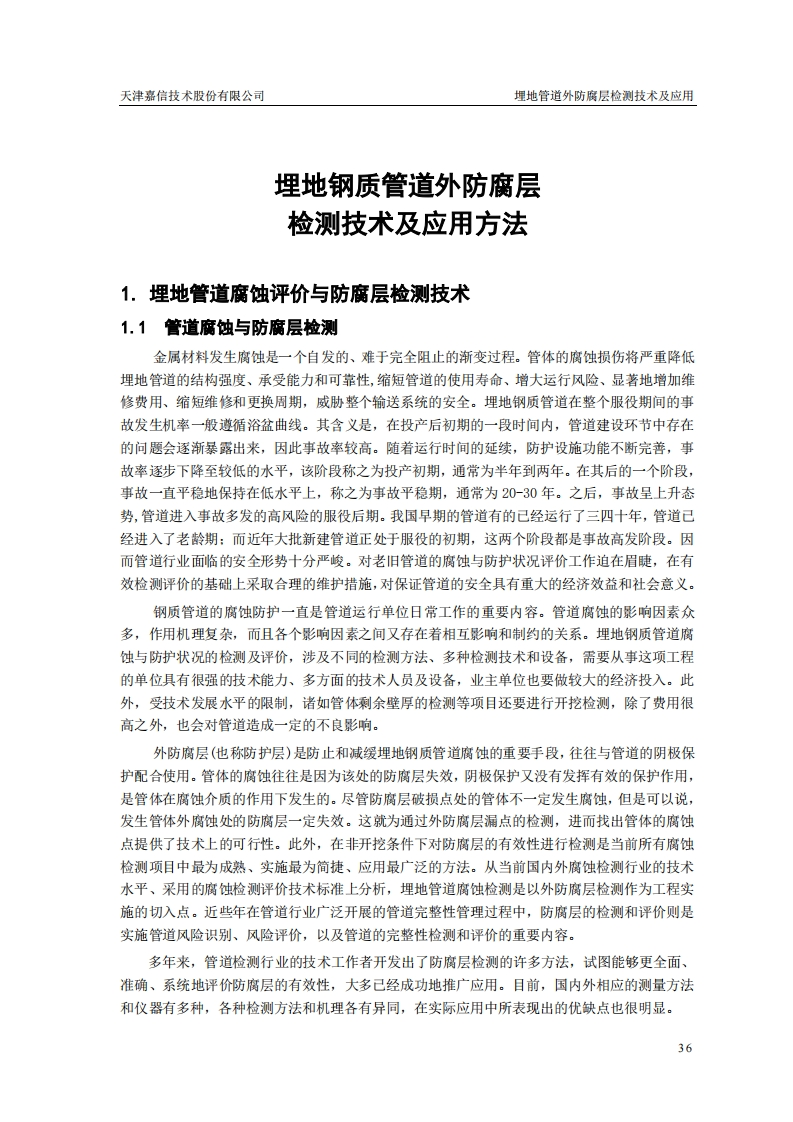 天津嘉信技术股份有限公司埋地管道外防腐层检测技术及应用埋地钢质管道外防腐层检测技术及应用方法1.埋地管道腐蚀评价与防腐层检测技术1.1管道腐蚀与防腐层检测金属材料发生腐蚀是一个自发的、难于完全阻止的渐变过程。管体的腐蚀损伤将严重降低埋地管道的结构强度、承受能力和可靠性,缩短管道的使用寿命、增大运行风险、显著地增加维修费用、缩短维修和更换周期,威胁整个输送系统的安全。埋地钢质管道在整个服役期间的事故发生机率一般遵循浴盆曲线。其含义是,在投产后初期的一段时间内,管道建设环节中存在的问题会逐渐暴露出来,因此事故率较高。随着运行时间的延续,防护设施功能不断完善,事故率逐步下降至较低的水平,该阶段称之为投产初期,通常为半年到两年。在其后的一个阶段,事故一直平稳地保持在低水平上,称之为事故平稳期,通常为20-30年。之后,事故呈上升态势,管道进入事故多发的高风险的服役后期。我国早期的管道有的己经运行了三四十年,管道己经进入了老龄期:而近年大批新建管道正处于服役的初期,这两个阶段都是事故高发阶段。因而管道行业面临的安全形势十分严峻。对老旧管道的腐蚀与防护状况评价工作迫在眉睫,在有效检测评价的基础上采取合理的维护措施,对保证管道的安全具有重大的经济效益和社会意义。钢质管道的腐蚀防护一直是管道运行单位日常工作的重要内容。管道腐蚀的影响因素众多,作用机理复杂,而且各个影响因素之间又存在着相互影响和制约的关系。埋地钢质管道腐蚀与防护状况的检测及评价,涉及不同的检测方法、多种检测技术和设备,需要从事这项工程的单位具有很强的技术能力、多方面的技术人员及设备,业主单位也要做较大的经济投入。此外,受技术发展水平的限制,诸如管体剩余壁厚的检测等项目还要进行开挖检测,除了费用很高之外,也会对管道造成一定的不良影响。外防腐层(也称防护层)是防止和减缓埋地钢质管道腐蚀的重要手段,往往与管道的阴极保护配合使用。管体的腐蚀往往是因为该处的防腐层失效,阴极保护又没有发挥有效的保护作用,是管体在腐蚀介质的作用下发生的。尽管防腐层破损点处的管体不一定发生腐蚀,但是可以说,发生管体外腐蚀处的防腐层一定失效。这就为通过外防腐层漏点的检测,进而找出管体的腐蚀点提供了技术上的可行性。此外,在非开挖条件下对防腐层的有效性进行检测是当前所有腐蚀检测项目中最为成熟、实施最为简捷、应用最广泛的方法。从当前国内外腐蚀检测行业的技术水平、采用的腐蚀检测评价技术标准上分析,埋地管道腐蚀检测是以外防腐层检测作为工程实施的切入点。近些年在管道行业广泛开展的管道完整性管理过程中,防腐层的检测和评价则是实施管道风险识别、风险评价,以及管道的完整性检测和评价的重要内容。多年来,管道检测行业的技术工作者开发出了防腐层检测的许多方法,试图能够更全面、准确、系统地评价防腐层的有效性,大多已经成功地推广应用。目前,国内外相应的测量方法和仪器有多种,各种检测方法和机理各有异同,在实际应用中所表现出的优缺点也很明显。36