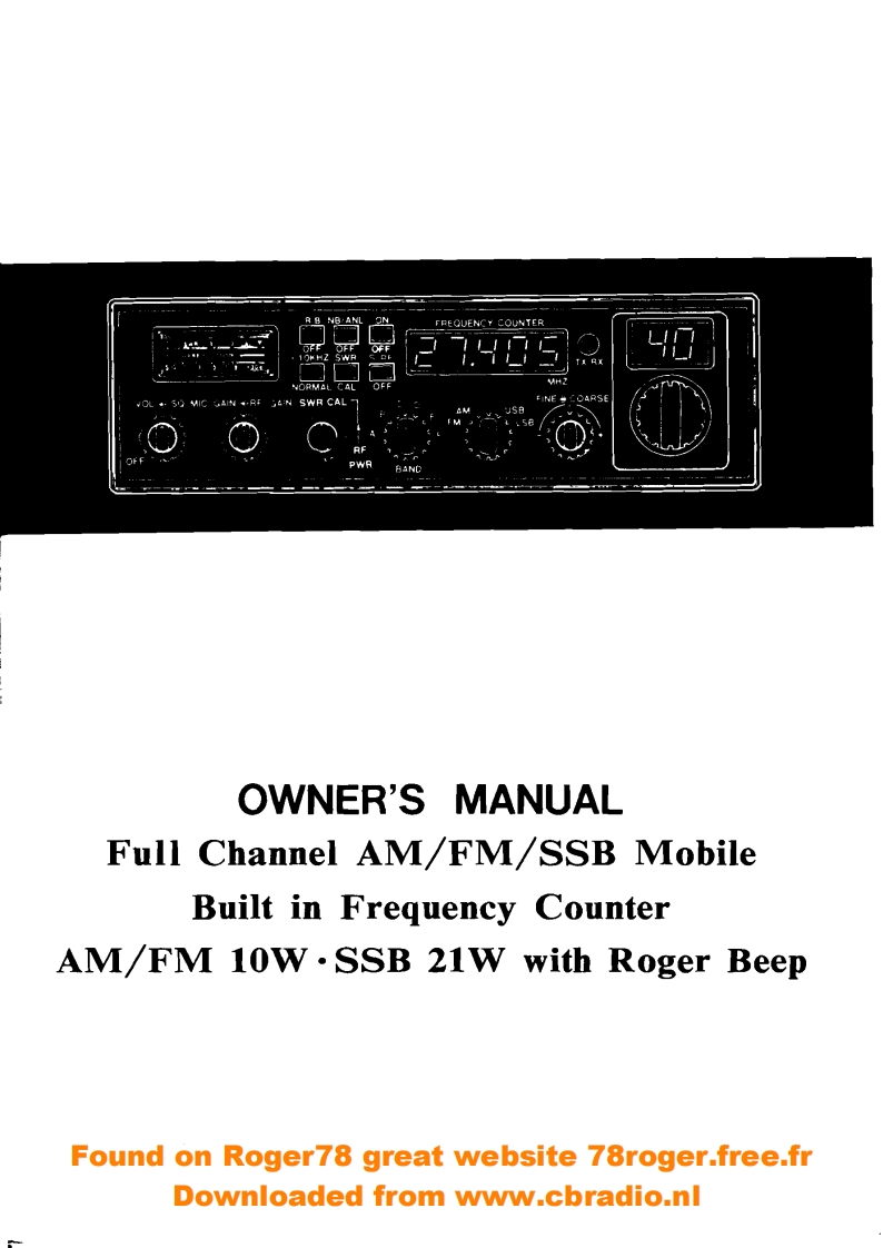 FREQUENCY COUNTER27.40940.SWR CALOWNER'SMANUALFull Channel AM/FM/SSB MobileBuilt in Frequency CounterAM/FM 10W.SSB 21W with Roger BeepFound on Roger78 great website 78roger.free.frDownloaded from www.cbradio.nl