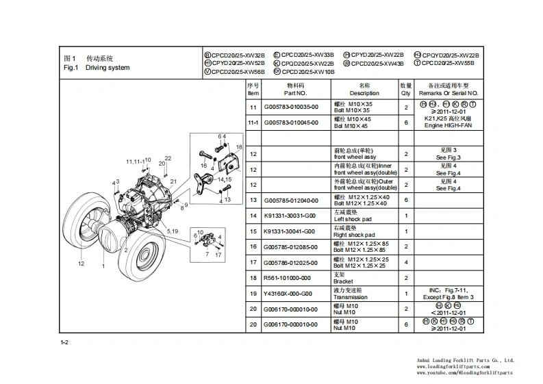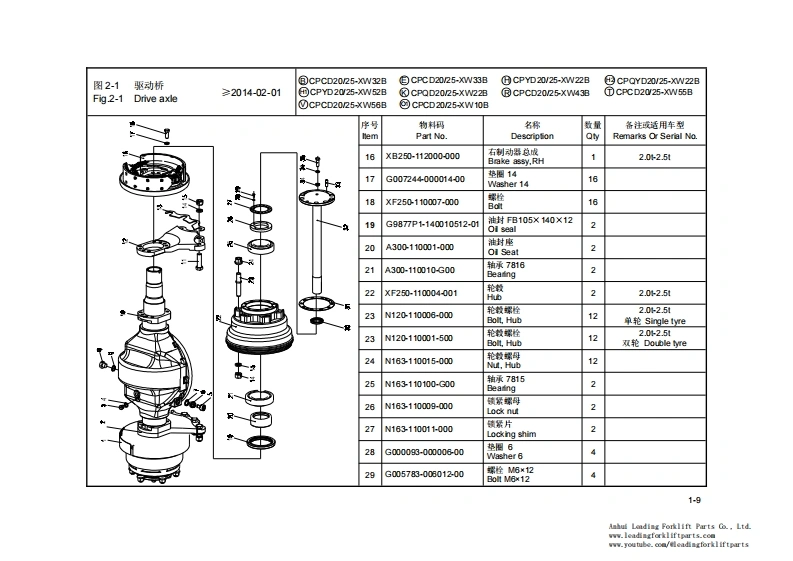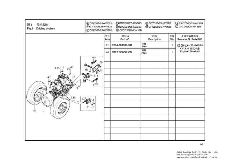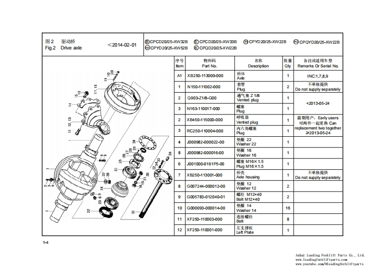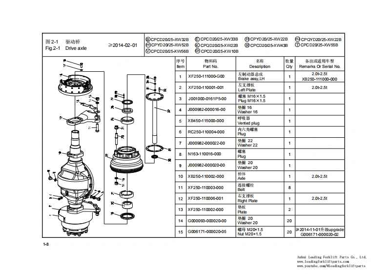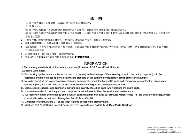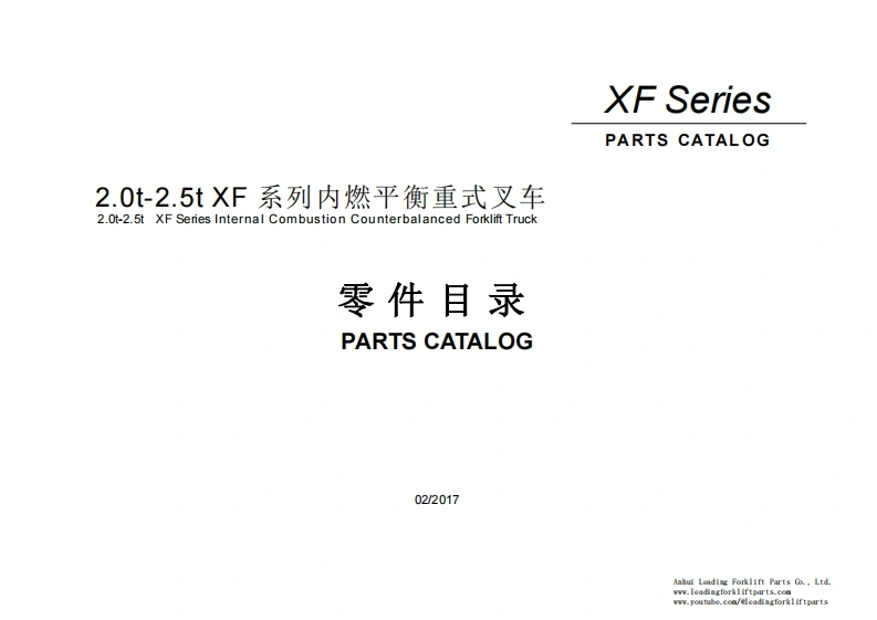 XF SeriesPARTS CATALOG2.0t-2.5tXF系列内燃平衡重式叉车2.01-2.5 XF Series Internal Combustion Counterbalanced Forkin Truck零件目录PARTS CATALOG022017Hangcha Forklift Parts ManualHC Hangcha CPCD25 Spare Parts CatalogHangcha 2.0t-2.5t XF Series Internal CombustionCounterbalanced Forklift TruckThis catalog collects all of the components in a series of 2-2.5 ton XF forklift trucksNoted:1.Looking up the series number of the part in the drawing of the assembly,in which thepart is in the catalog,and then the codes of the drawing and standard of the part in termsof the series number.2.No noted are all of the interchangeable parts and components,non-interchangeable partsand components are noted that which model can be applied,and it will be noted at the topright corner of the catalogue and corresponding remark.3.Container forklift truck and CP series truck are the same except for the lifting system.4.For Mast parts see "2-3.5T XF Series Internal Combustion Counterbalanced ForkliftTruck Mast Parts Catalog".Anhui Leading Forklift Parts Co.,Ltd.www.leadingforkliftparts.comwww.youtube.com/@leadingforkliftparts