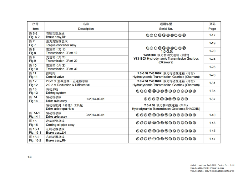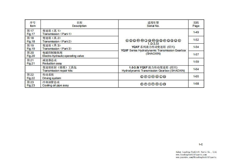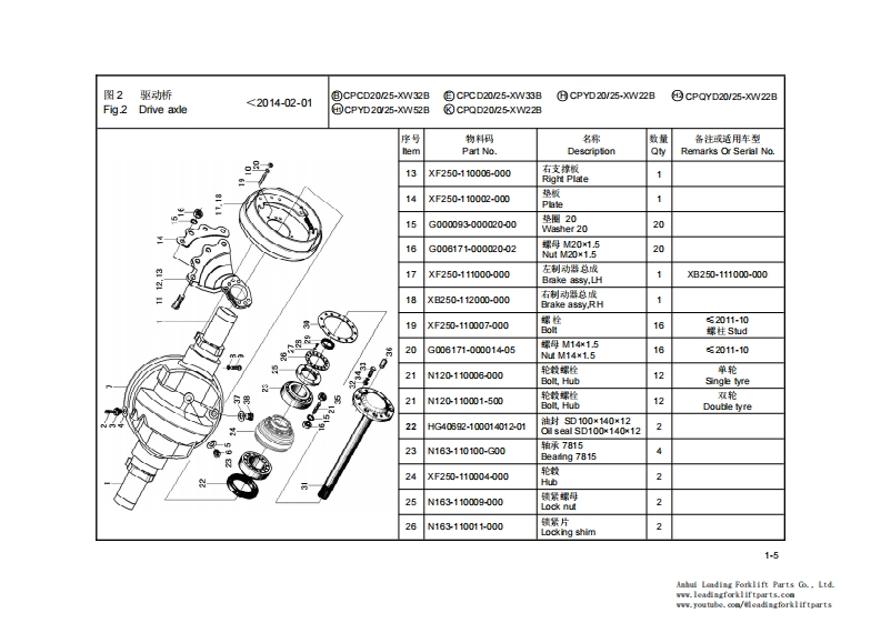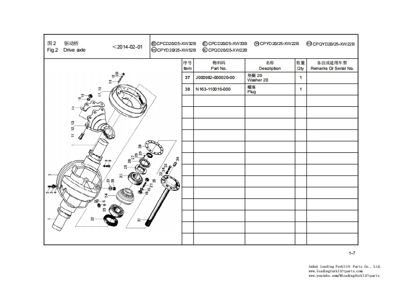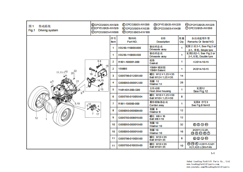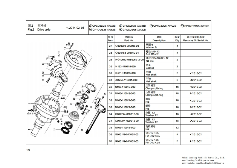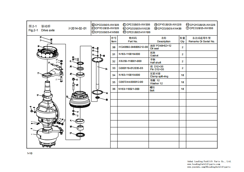 XF SeriesPARTS CATALOG2.0t-2.5tXF系列内燃平衡重式叉车2.01-2.5 XF Series Internal Combustion Counterbalanced Forkin Truck零件目录PARTS CATALOG022017Hangcha Forklift Parts ManualHC Hangcha CPCD25 Spare Parts CatalogHangcha 2.0t-2.5t XF Series Internal CombustionCounterbalanced Forklift TruckThis catalog collects all of the components in a series of 2-2.5 ton XF forklift trucksNoted:1.Looking up the series number of the part in the drawing of the assembly,in which thepart is in the catalog,and then the codes of the drawing and standard of the part in termsof the series number.2.No noted are all of the interchangeable parts and components,non-interchangeable partsand components are noted that which model can be applied,and it will be noted at the topright corner of the catalogue and corresponding remark.3.Container forklift truck and CP series truck are the same except for the lifting system.4.For Mast parts see "2-3.5T XF Series Internal Combustion Counterbalanced ForkliftTruck Mast Parts Catalog".Anhui Leading Forklift Parts Co.,Ltd.www.leadingforkliftparts.comwww.youtube.com/@leadingforkliftparts