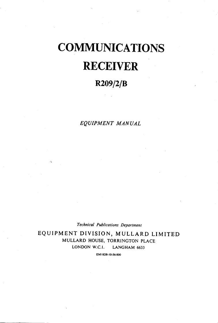 COMMUNICATIONSRECEIVERR209/2/BEQUIPMENT MANUALTechnical Publications DepartmentEQUIPMENT DIVISION,MULLARD LIMITEDMULLARD HOUSE,TORRINGTON PLACELONDON W.C.1.LANGHAM 6633EM182B-10-56-800