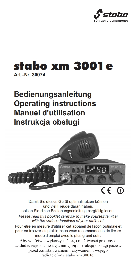 stoboFOR GUTE VERBINDUNGstabo xm 300eArt.-Nr.30074BedienungsanleitungOperating instructionsManuel d'utilisationInstrukcja obstugim3001日Damit Sie dieses Gerat optimal nutzen konnenund viel Freude daran haben,sollten Sie diese Bedienungsanleitung sorgfaltig lesen.Please read this booklet carefully to make yourself familiarwith the various functions of your radio set.Pour etre en mesure d'utiliser cet appareil de facon optimale etpour en trouver du plaisir,nous vous recommandons de lire cemode d'emploi avec le plus grand soin.Aby wlasciwie wykorzystac jego mozliwosci prosimy odokladne zapoznanie sie z niniejsza instrukcja obstugi jeszczeprzed zainstalowaniem i uzywaniem Twojegoradiotelefonu stabo xm 3001e.