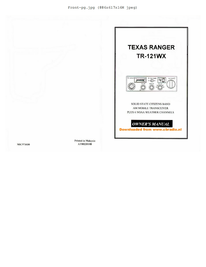 Front-pg.jpg (886x617x16M jpeg)TEXAS RANGERTR-121WX4可®SOLID STATE CITIZENS BANDAM MOBILE TRANSCEIVERPLUS 6 NOAA WEATHER CHANNELSOWNER'S MANUALDownloaded from www.cbradio.nlPrinted in MalaysiaM1C971030AT0022010B