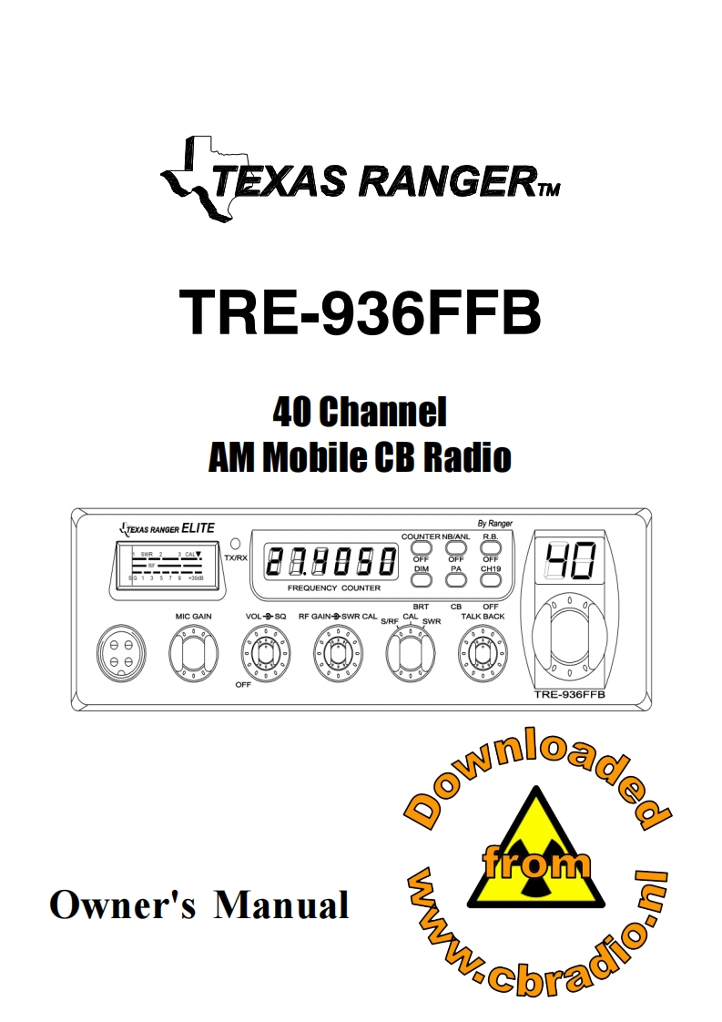TEXAS RANGERTRE-936FFB40 ChannelAM Mobile CB RadioTEXAS RANGER ELITEBy RangerCOUNTER NB/ANLR.B.2一TX/RX且8888DIMPACH1990FREQUENCY COUNTERBRTMIC GAINRF GAINSWR CALTALK BACKeeTRE-936FFBD)⊙vy©©②dOwner's ManualXAIA?An②6iONw