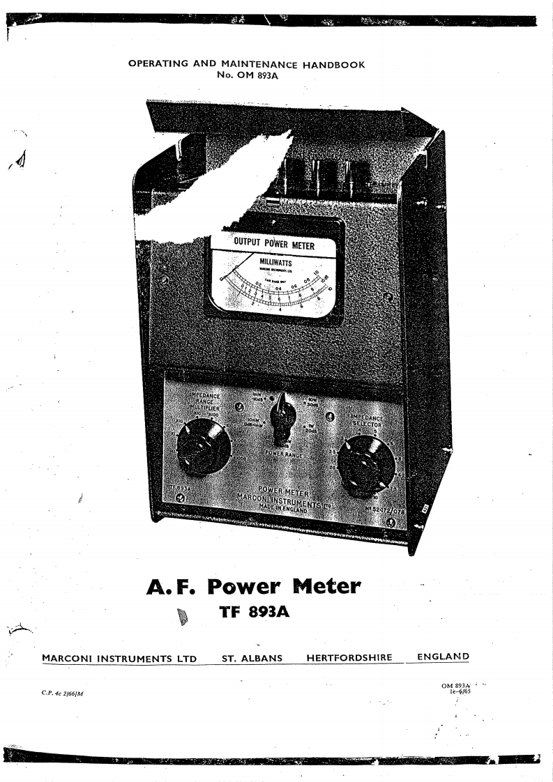 OPERATING AND MAINTENANCE HANDBOOKNo.OM 893AOUTPUT POWER METERMILLWATTS04POWER METERMADE IH ENGLANA.F.Power Meter最TF 893AMARCONI INSTRUMENTS LTD ST.ALBANSHERTFORDSHIREENGLANDC.P,4c266MOM2落·