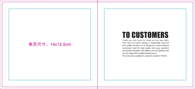 TO CUSTOMERSThank you very much for using our two way radio.单页尺寸:14x12.5cmThis radio of moder design is reasonable structurewith stable functions.It is designed to meet differentcustomers'need for high quality with easy operationand perfect capablty.We believe you are pleased withits nice shape and excellent perfommance.This manual is suitable for using the model of TH-350.