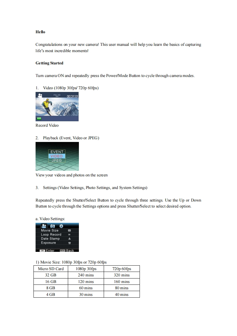 HelloCongratulations on your new camera!This user manual will help you learn the basics of capturinglife's most incredible moments!Getting StartedTum camera ON and repeatedly press the Power/Mode Button to cycle through camera modes.1.Video(1080p 30fps/720p 60fps)0031:01Record Video2.Playback(Event,Video or JPEG)EVENTVIDEOJPEGView your videos and photos on the screen3.Settings(Video Settings,Photo Settings,and System Settings)Repeatedly press the Shutter/Select Button to cycle through three settings.Use the Up or DownButton to cycle through the Settings options and press Shutter/Select to select desired option.a.Video Settings:巴问米Movie SizeLoop RecordDate StampExposure图Enter Back1)Movie Size:1080p 30fps or 720p 60fpsMicro SD Card1080p30fps720p 60fps32 GB240 mins320 mins16 GB120 mins160 mins8GB60 mins80 mins4GB30mins40 mins