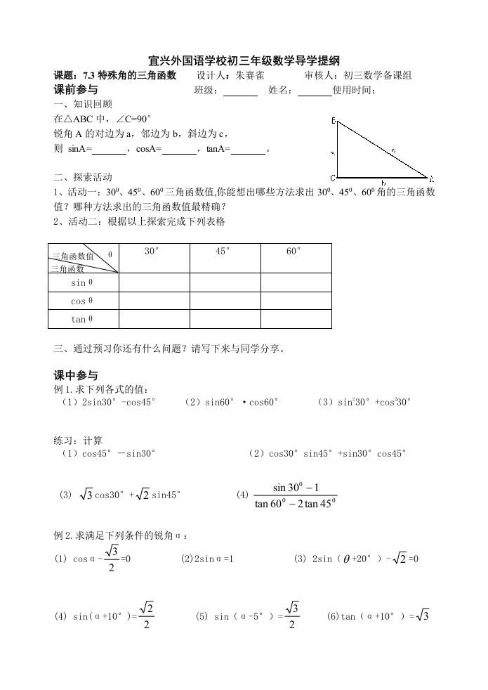 宜兴外国语学校初三年级数学导学提纲课题:73特殊角的三角函数设计人:朱赛雀审核人:初三数学备课组课前参与班级:姓名:使用时间:一、知识回顾在△ABC中,∠C=90锐角A的对边为a,邻边为b,斜边为c,则simA=,c0sA=,anA=二、探索活动1、活动一:30°、450、60°三角函数值,你能想出哪些方法求出30°、450、600角的三角函数值?哪种方法求出的三角函数值最精确?2、活动二:根据以上探索完成下列表格三角函数值304560三角函数sin0cos 8tan 8三、通过预习你还有什么问题?请写下来与同学分享。课中参与例1.求下列各式的值:(1)2sin30°-cos45(2)sin60°·cos60(3)sin230°+cos230°练习:计算(1)c0s45°-sin30(2)c0s30°sin45°+sin30°c0s45(3)√5cos30°+√2sin45sin30°-1(4)tan60°-2tan450例2.求满足下列条件的锐角ā:(1)cos a-=0(2)2sina=1(3)2sin(0+20°)-√2=02④sin(a+10)=V)》sin(a5°)=(6)tan(a+10°)=√522