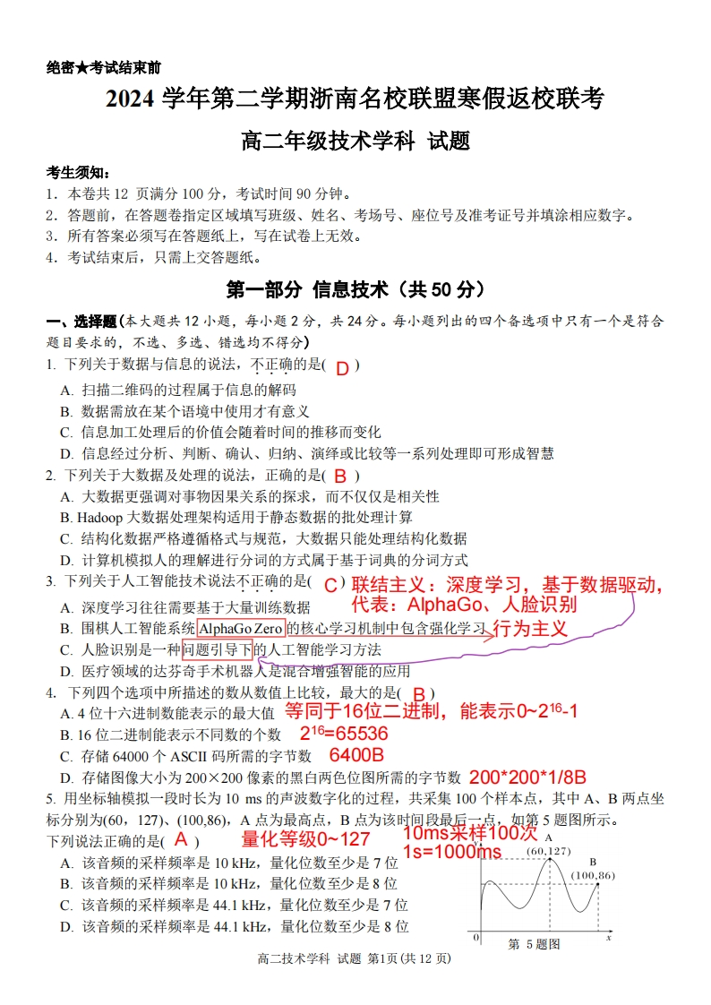 绝密★考试结束前2024学年第二学期浙南名校联盟寒假返校联考高二年级技术学科试题考生须知:1.本卷共12页满分100分,考试时间90分钟。2.答题前,在答题卷指定区域填写班级、姓名、考场号、座位号及准考证号并填涂相应数字。3.所有答案必须写在答题纸上,写在试卷上无效。4.考试结束后,只需上交答题纸。第一部分信息技术(共50分)一、选择题(本大题共12小题,每小题2分,共24分。每小题列出的四个备选项中只有一个是符合题目要求的,不选、多选、错选均不得分)1.下列关于数据与信息的说法,不正确的是(D)A.扫描二维码的过程属于信息的解码B.数据需放在某个语境中使用才有意义C.信息加工处理后的价值会随着时间的推移而变化D.信息经过分析、判断、确认、归纳、演绎或比较等一系列处理即可形成智慧2.下列关于大数据及处理的说法,正确的是(B)A.大数据更强调对事物因果关系的探求,而不仅仅是相关性B.Hadoop大数据处理架构适用于静态数据的批处理计算C.结构化数据严格遵循格式与规范,大数据只能处理结构化数据D.计算机模拟人的理解进行分词的方式属于基于词典的分词方式3.下列关于人工智能技术说法不正确的是(C)联结主义:深度学习,基于数据驱动,A.深度学习往往需要基于大量训练数据代表:AlphaGo、人脸识别B.围棋人工智能系统AlphaGo Zero的核心学习机制中包含强化学习行为主义C.人脸识别是一种问题引导下的人工智能学习方法D.医疗领域的达芬奇手术机器人是混合增强智能的应用4.下列四个选项中所描述的数从数值上比较,最大的是(B)A.4位十六进制数能表示的最大值等同于16位二进制,能表示0216.1B.16位二进制能表示不同数的个数216=65536C.存储64000个ASCI码所需的字节数6400BD.存储图像大小为200×200像素的黑白两色位图所需的字节数200*200*1/8B5.用坐标轴模拟一段时长为10s的声波数字化的过程,共采集100个样本点,其中A、B两点坐标分别为60,17小Q0036,A点为是亮点克为该8照悬躁样06爱5,。如第5题图所示。下列说法正确的是(A)量化等级0~127A.该音频的采样频率是10kHz,量化位数至少是7位1s=1000ms..60,27)B(100.86)B.该音频的采样频率是10kHz,量化位数至少是8位C.该音频的采样频率是44.1kHz,量化位数至少是7位D.该音频的采样频率是44.1kHz,量化位数至少是8位0第5题图高二技术学科试题第1页(共12页)