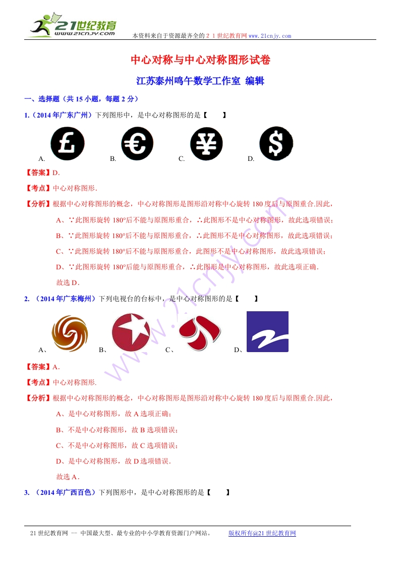 27世纪教育uu山21 cnv.com本资料来自于资源最齐全的21世纪教育网m.21cnjy.com中心对称与中心对称图形试卷江苏泰州鸣午数学工作室编辑一、选择题(共15小题,每题2分)1.(2014年广东广州)下列图形中,是中心对称图形的是【A【答案】D.【考点】中心对称图形。【分析】根据中心对称图形的概念,中心对称图形是图形沿对称中心旋转180度后与原图重合.因此,A、,此图形旋转180°后不能与原图形重合,此图形不是中心对称图形,故此选项错误:B、,此图形旋转180°后不能与原图形重合,∴,此图形不是中心对称图形,故此选项错误:C、,此图形旋转180°后不能与原图形重合,此图形不是中心对称图形,故此选项错误:D、,此图形旋转180°后能与原图形重合,∴,此图形是中心对称图形,故此选项正确。故选D2.(2014年广东梅州)下列电视台的台标中,是中心对称图形的是【A【答案】A【考点】中心对称图形【分析】根据中心对称图形的概念,中心对称图形是图形沿对称中心旋转180度后与原图重合.因此,A、是中心对称图形,故A选项正确:B、不是中心对称图形,故B选项错误:C、不是中心对称图形,故C选项错误:D、是中心对称图形,故D选项错误.故选A.3.(2014年广西百色)下列图形中,是中心对称图形的是【】21世纪教育网一中国最大型、最专业的中小学教育资源门户网站。版权所有@21世纪教育网