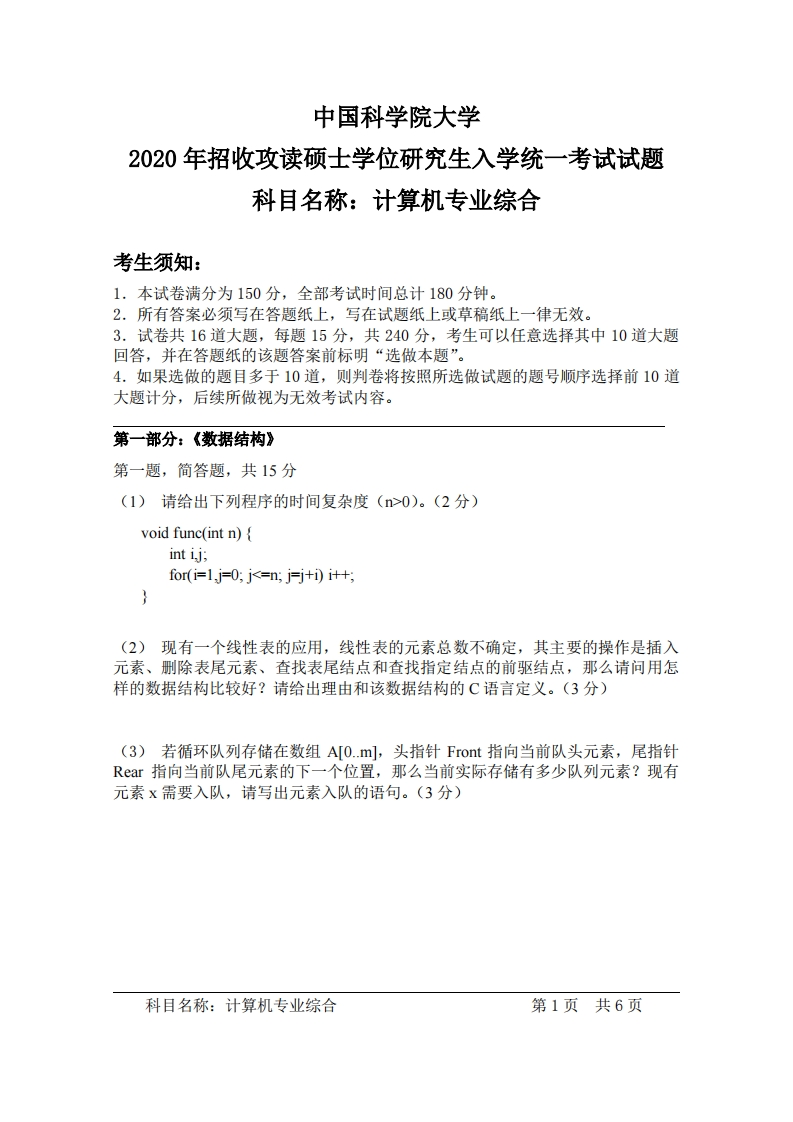 中国科学院大学2020年招收攻读硕士学位研究生入学统一考试试题科目名称:计算机专业综合考生须知:1.本试卷满分为150分,全部考试时间总计180分钟。2.所有答案必须写在答题纸上,写在试题纸上或草稿纸上一律无效。3.试卷共16道大题,每题15分,共240分,考生可以任意选择其中10道大题回答,并在答题纸的该题答案前标明“选做本题”。4.如果选做的题目多于10道,则判卷将按照所选做试题的题号顺序选择前10道大题计分,后续所做视为无效考试内容。第一部分:《数据结构》第一题,简答题,共15分(1)请给出下列程序的时间复杂度(>0)。(2分)void func(int n)int ij;for(i=l,j=0,j=n,jj+i)i计+;(2)现有一个线性表的应用,线性表的元素总数不确定,其主要的操作是插入元素、删除表尾元素、查找表尾结点和查找指定结点的前驱结点,那么请问用怎样的数据结构比较好?请给出理由和该数据结构的C语言定义。(3分)(3)若循环队列存储在数组A[0.m],头指针Frot指向当前队头元素,尾指针Rear指向当前队尾元素的下一个位置,那么当前实际存储有多少队列元素?现有元素x需要入队,请写出元素入队的语句。(3分)科目名称:计算机专业综合第1页共6页