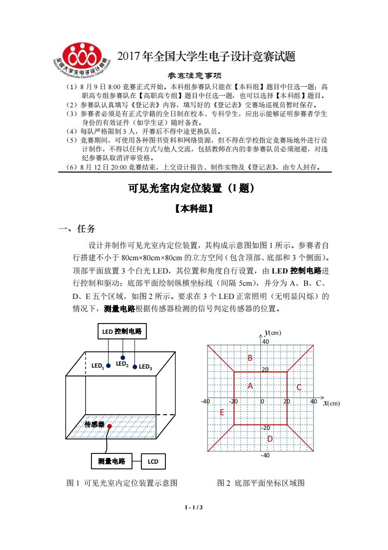 662017年全国大学生电子设计竞赛试题参寒注意事项(1)8月9日8:00竞赛正式开始。本科组参赛队只能在【本科组】题目中任选一题:高职高专组参赛队在【高职高专组】题目中任选一题,也可以选择【本科组】题目。(2)参赛队认真填写《登记表》内容,填写好的《登记表》交赛场巡视员暂时保存。(3)参赛者必须是有正式学籍的全日制在校本、专科学生,应出示能够证明参赛者学生身份的有效证件(如学生证)随时备查(4)每队严格限制3人,开赛后不得中途更换队员。(5)竞赛期间,可使用各种图书资料和网络资源,但不得在学校指定竞赛场地外进行设计制作,不得以任何方式与他人交流,包括教师在内的非参赛队员必须迴避,对违纪参赛队取消评审资格。(6)8月12日20:00竞赛结束,上交设计报告、制作实物及《登记表》,由专人封存。可见光室内定位装置(1题)【本科组】一、任务设计并制作可见光室内定位装置,其构成示意图如图1所示。参赛者自行搭建不小于80cmx80cm×80cm的立方空间(包含顶部、底部和3个侧面)。顶部平面放置3个白光LED,其位置和角度自行设置,由LED控制电路进行控制和驱动:底部平面绘制纵横坐标线(间隔5Cm),并分为A、B、C、D、E五个区域,如图2所示。要求在3个LED正常照明(无明显闪烁)的情况下,测量电路根据传感器检测的信号判定传感器的位置。LED控制电路Mcm)40BLED1●02040Xcm)】传感器-20D-40测量电路LCD图1可见光室内定位装置示意图图2底部平面坐标区域图1-1/3