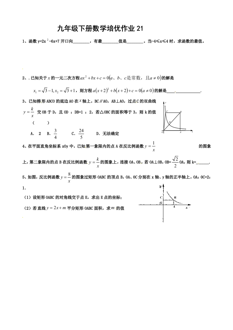 九年级下册数学培优作业211、函数y=2x26x+7开口向,有最值是。当-4≤x≤4时,求函数的最值。2、.已知关于x的一元二次方程ax2+bx+c=0(a、b、c是常数,且a≠0)的解是x=√5-1,x2=V5+1,则方程a(x+2}+b(x+2)+c=0(a≠0)的解是3、已知梯形ABC0的底边A0在x轴上,BC∥AO,AB⊥AO,过点C的双曲线y=《交OB于D,且OD:DB=1:2,若△OBC的面积等于3,则k的值()A.2B.3C34D.无法确定54、在平面直角坐标系x0y中,已知第一象限内的点A在反比例函数y=I的图象点B在反比例函数y-的图象上,连接OA、0B,若OA10B,0BY5、如图,反比例函数y=8的图象过矩形OC的顶点B,0A、0C分别在x轴、y轴的正半轴上,0A:0C-2:1.(1)设矩形OABC的对角线交于点E,求出E点的坐标:(2)若直线y=2x+m平分矩形0ABC面积,求m的值