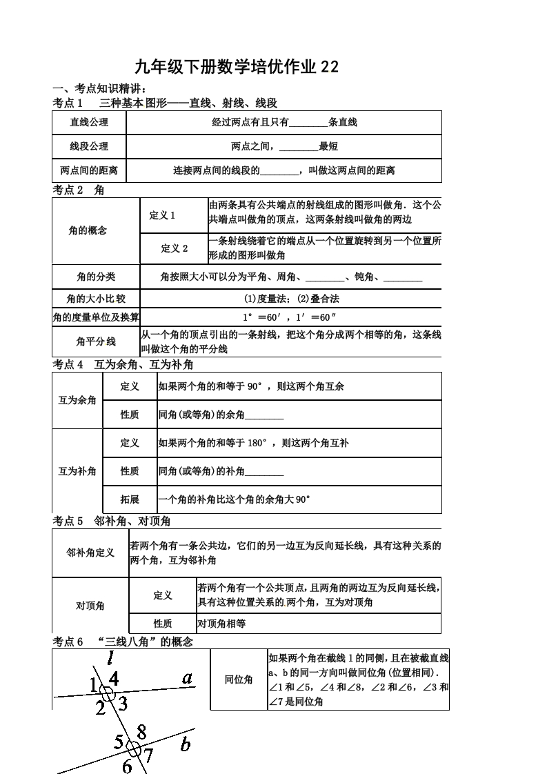 九年级下册数学培优作业22一、考点知识精讲:考点1三种基本图形一一直线、射线、线段直线公理经过两点有且只有条直线线段公理两点之间,最短两点间的距离连接两点间的线段的叫做这两点间的距离考点2角由两条具有公共端点的射线组成的图形叫做角.这个公定义1共端点叫做角的顶点,这两条射线叫做角的两边角的概念条射线绕着它的端点从一个位置旋转到另一个位置所定义2形成的图形叫做角角的分类角按照大小可以分为平角、周角、、钝角、角的大小比较(1)度量法;(2)叠合法角的度量单位及换算1°=60',1'=60”角平分线从一个角的顶点引出的一条射线,把这个角分成两个相等的角,这条线叫做这个角的平分线考点4互为余角、互为补角定义如果两个角的和等于90°,则这两个角互余互为余角性质同角(或等角)的余角】定义如果两个角的和等于180°,则这两个角互补互为补角性质同角(或等角)的补角」拓展个角的补角比这个角的余角大90°考点5邻补角、对顶角邻补角定义若两个角有一条公共边,它们的另一边互为反向延长线,具有这种关系的两个角,互为邻补角若两个角有一个公共顶点,且两角的两边互为反向延长线,定义对顶角具有这种位置关系的两个角,互为对顶角性质对顶角相等考点6“三线八角”的概念如果两个角在截线1的同侧,且在被截直线同位角a、b的同一方向叫做同位角(位置相同).∠1和∠5,∠4和∠8,∠2和∠6,∠3和∠7是同位角58b