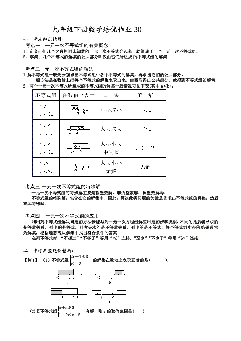 九年级下册数学培优作业30一、考点知识精讲:考点一一元一次不等式组的有关概念1.定义:把几个含有相同未知数的一元一次不等式合起来,就组成了一个一元一次不等式组.2.解集:几个不等式的解集的公共部分叫做由它们所组成的不等式组的解集.考点二一元一次不等式组的解法1.解不等式组一般先分别求出不等式组中各个不等式的解集,再求出它们的公共部分。一般方法是在数轴上把每个不等式的解集表示出来,由图形得出公共部分,就得到不等式组的解集,2.两个一元一次不等式所组成的不等式组的解集一般情况可见下表(其中a-301x+a≥0(2)若不等式组1-2x>x-2有解,则a的取值范围是()