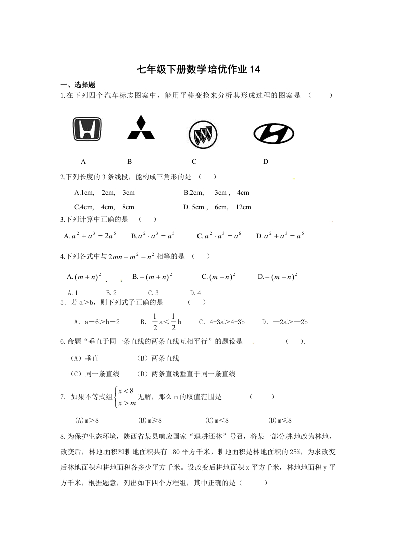 七年级下册数学培优作业14一、选择题1.在下列四个汽车标志图案中,能用平移变换来分析其形成过程的图案是()AB2.下列长度的3条线段,能构成三角形的是()A.1cm,2cm,3cmB.2cm,3cm,4cmC.4cm,4cm,8cmD.5cm,6cm,12cm3.下列计算中正确的是()A.a2+a3=2a5B.a2.a3=asC.a2.a3=aD.a2+a3=as4.下列各式中与2m-m2-n2相等的是()A.(m+m)2.,B.-(m+m)2C.(m-n)2D.-(m-n)2A.1B.2C.3D.45.若a>b,则下列式子正确的是()1A.a-6>b-2B.abC.4+3a>4+3bD.-2a>-2b6.命题“垂直于同一条直线的两条直线互相平行”的题设是(A)垂直(B)两条直线(C)同一条直线(D)两条直线垂直于同一条直线x<87.如果不等式组无解,那么m的取值范围是x >m(A)m>8(B)m≥8(C)m<8(D)m≤88.为保护生态环境,陕西省某县响应国家“退耕还林”号召,将某一部分耕地改为林地,改变后,林地.面积和耕地面积共有180平方千米,耕地面积是林地面积的25%,为求改变后林地面积和耕地面积各多少平方千米。设改变后耕地面积x平方千米,林地地面积y平方千米,根据题意,列出如下四个方程组,其中正确的是()